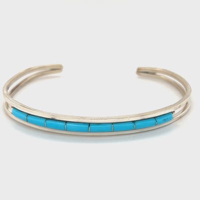 This exquisitely handcrafted Zuni cuff bracelet is a timeless design. Features channel-set inlaid stones with either sleeping beauty turquoise or white opals, a simple yet striking modern piece. This is the perfect, minimal bracelet for stacking and stunning enough to be worn on its own. Complete that classy, chic, boho vibe with this beautiful Native American cuff.