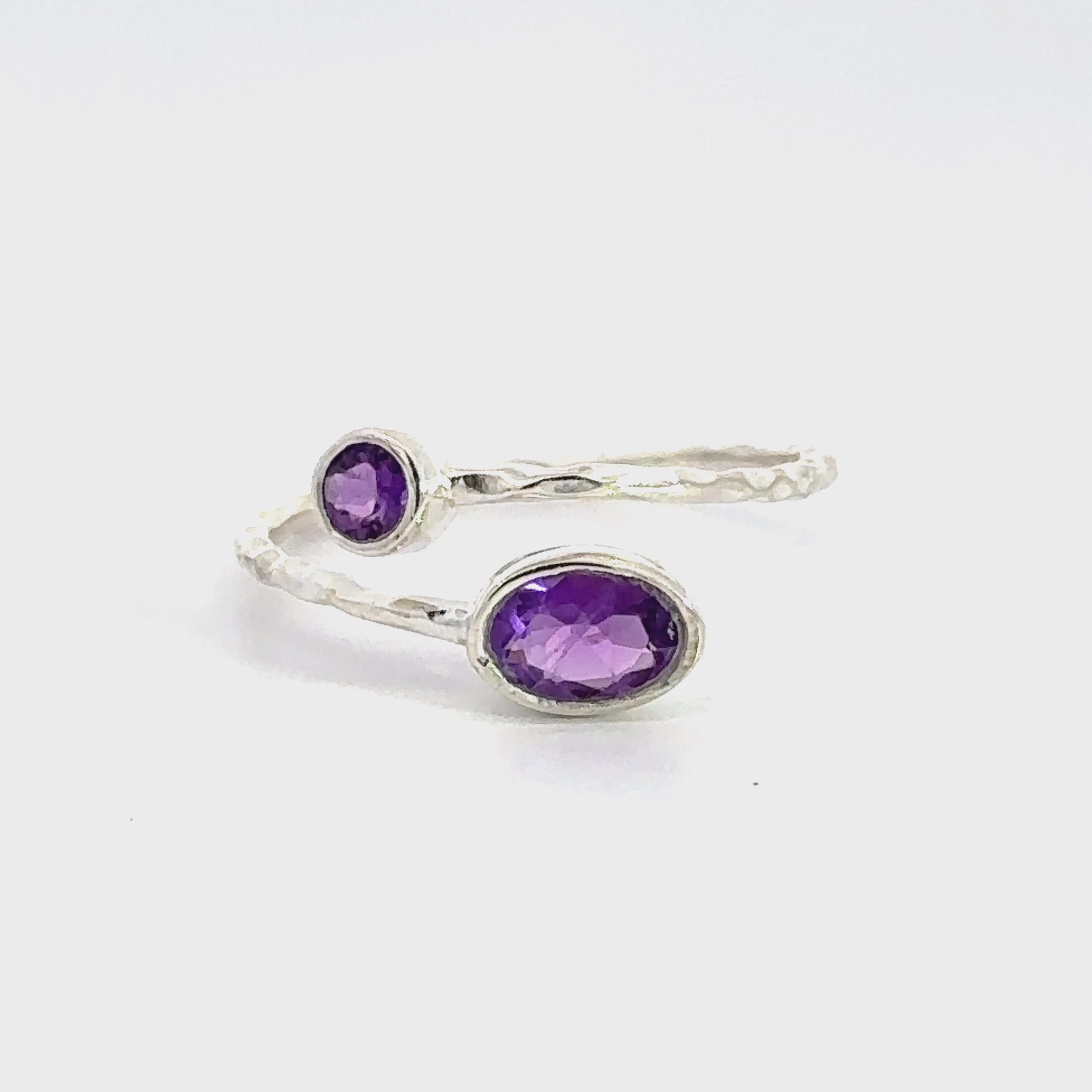 An Textured Adjustable Band with Adorned Gemstones ring with two purple gemstones on a white background.