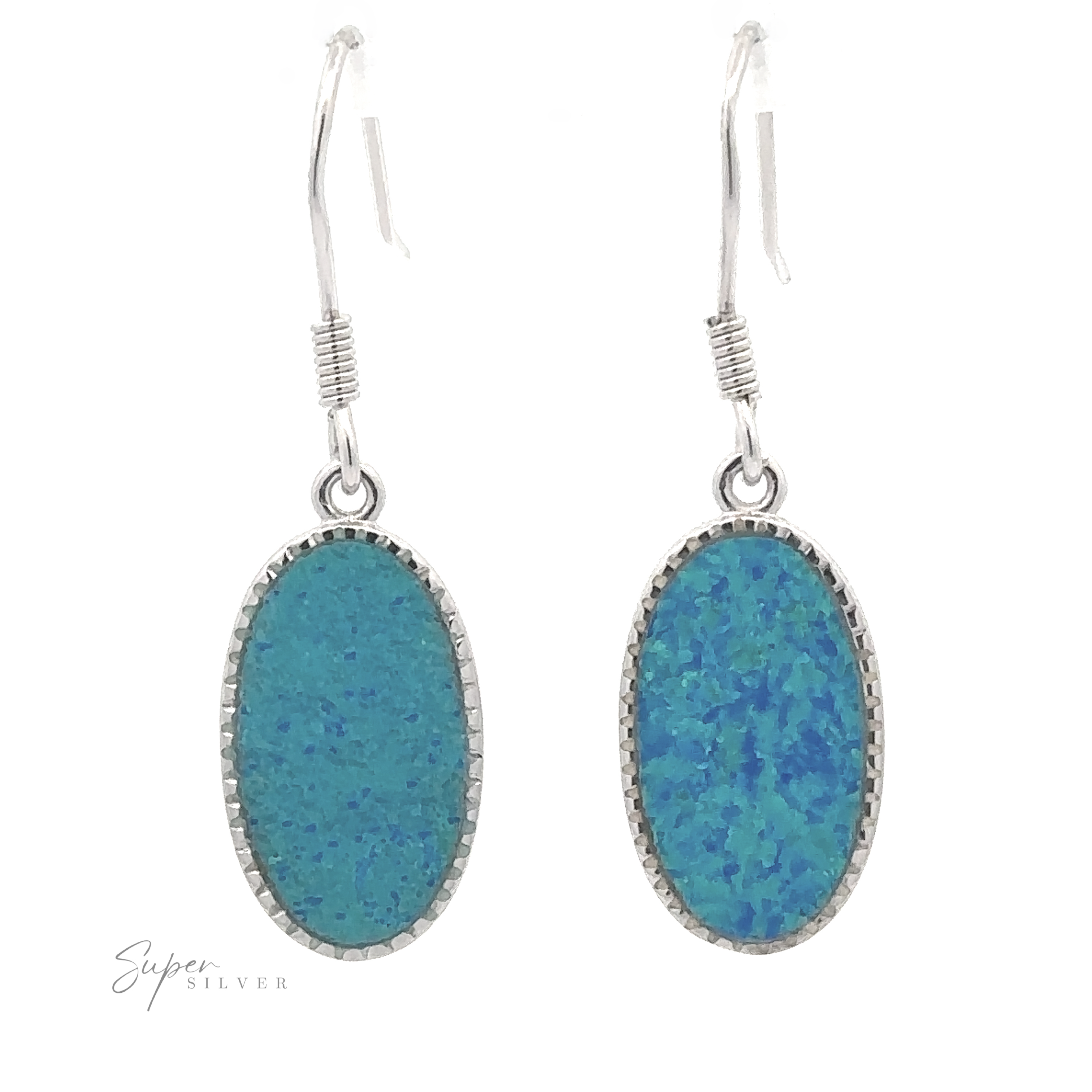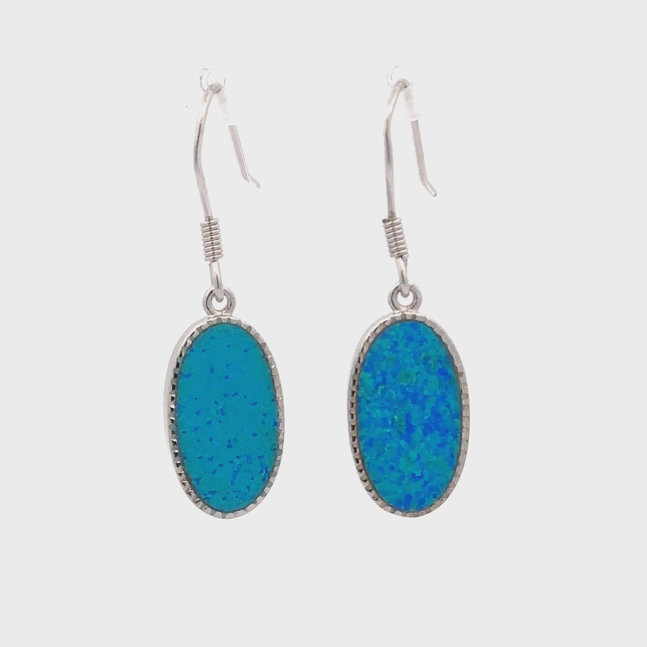 Brilliant in its simplicity, these stunning oval dangle earrings shimmer with the glittery elegance of blue lab-created opal. Framed by a rigid border, the opal’s vibrant hues radiate modern sophistication with a timeless design. Larger and more substantial, these earrings are sure to turn heads and add a touch of drama to your look. Whether you're dressing up for a special occasion or adding a little extra flair to your everyday style, these opal beauties are the perfect statement piece.