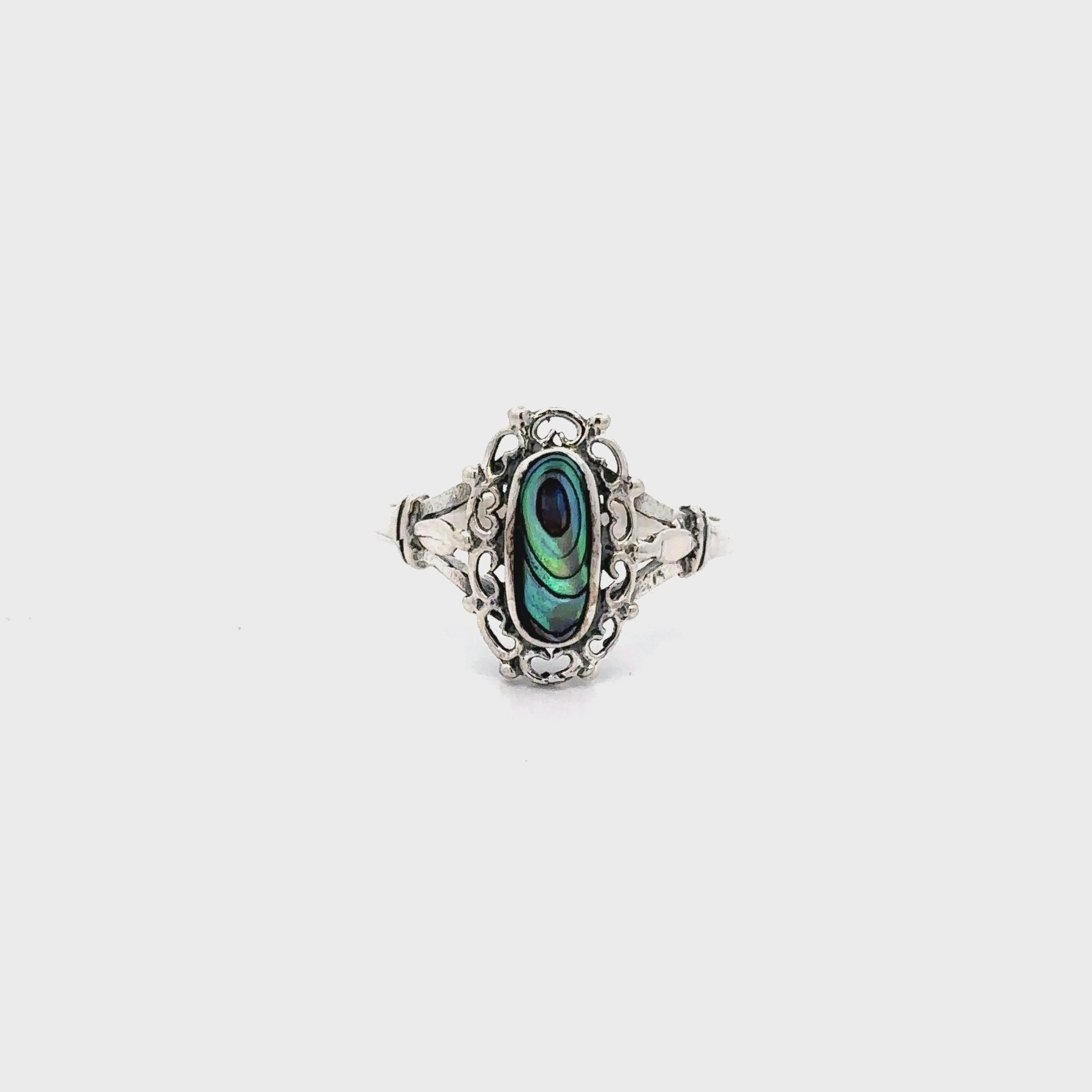 A delicate oval ring radiates vintage appeal with its lacey petals and sleek inlaid stones. Now offered in four stylish stone options so you can find the right color to fit your unique style. If you are looking for a mysterious antique vibe, then onyx, with its deep black depths, is for you! Onyx is believed to quiet powerful emotions while encouraging stillness and introspection. If you prefer earthier vibes, then get the colorful blue-greens of abalone, a striking shell that brings peace and tranquility, or the brilliant ocean blue or turquoise, a grounding stone that cleanses your energy. Finally, the pearly iridescence of mother of pearl is an elegant choice for a more subdued look that glistens in the sun. Mother-of-pearl is thought to have soothing, protective energies associated with a mother's nature and is known to heighten intuition. Whatever stone you choose, this ring is sure to become a favorite piece to add to your collection.