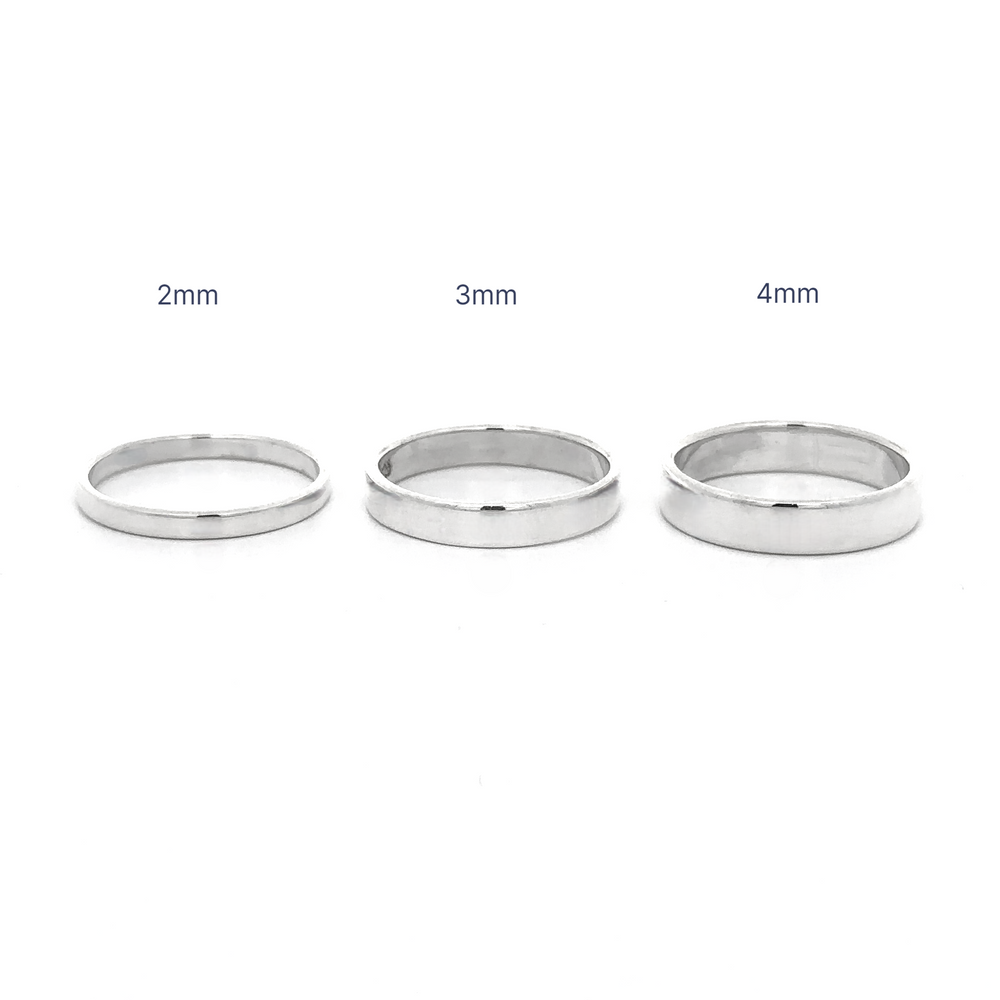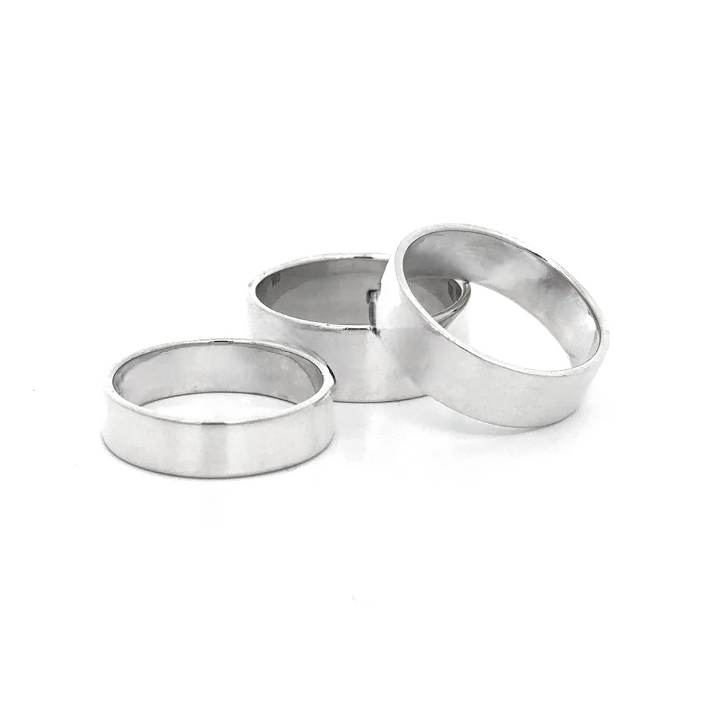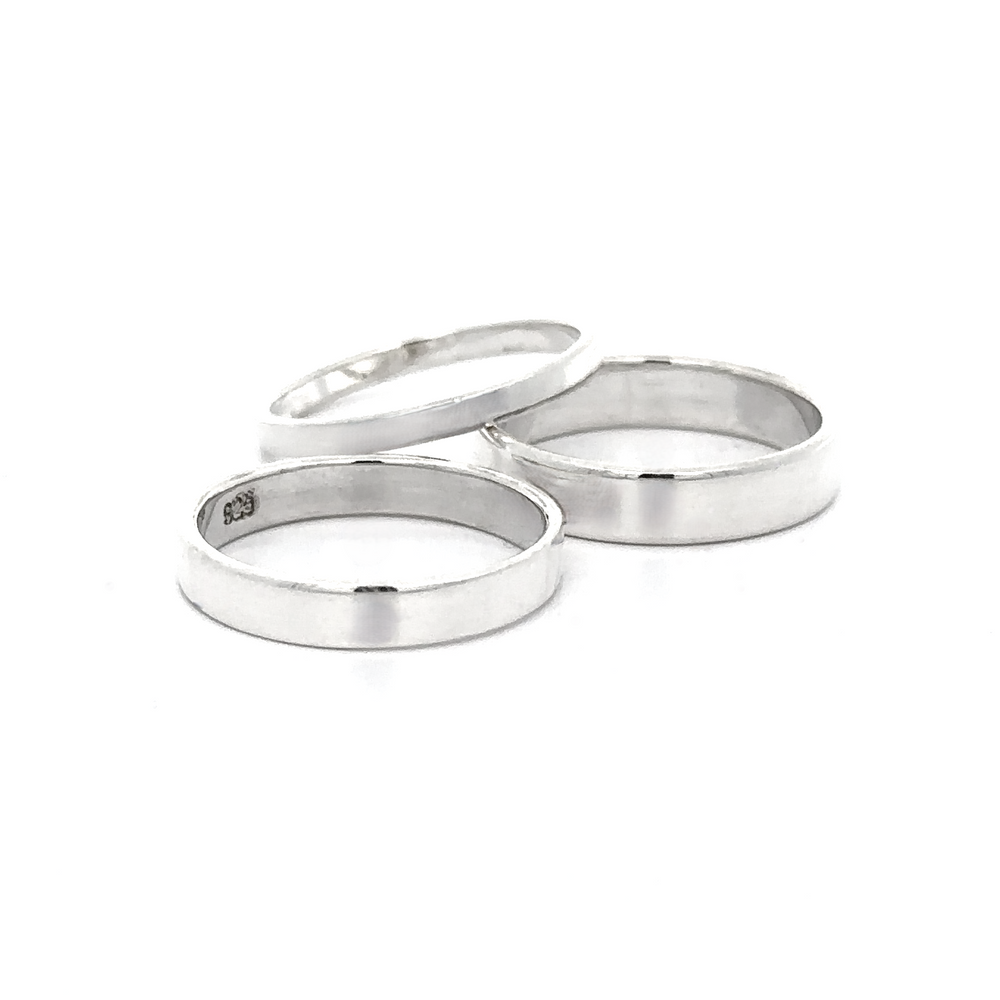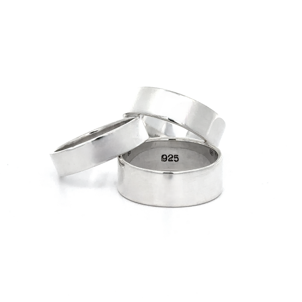 Three Minimal Bold Flat Band rings in plain sterling silver are stacked on a white background, with one flat band showing a "925" stamp inside to indicate genuine sterling silver.Three Minimal Bold Flat Band rings in plain sterling silver are shown on a white background, with two stacked together and one classic band lying flat in front.