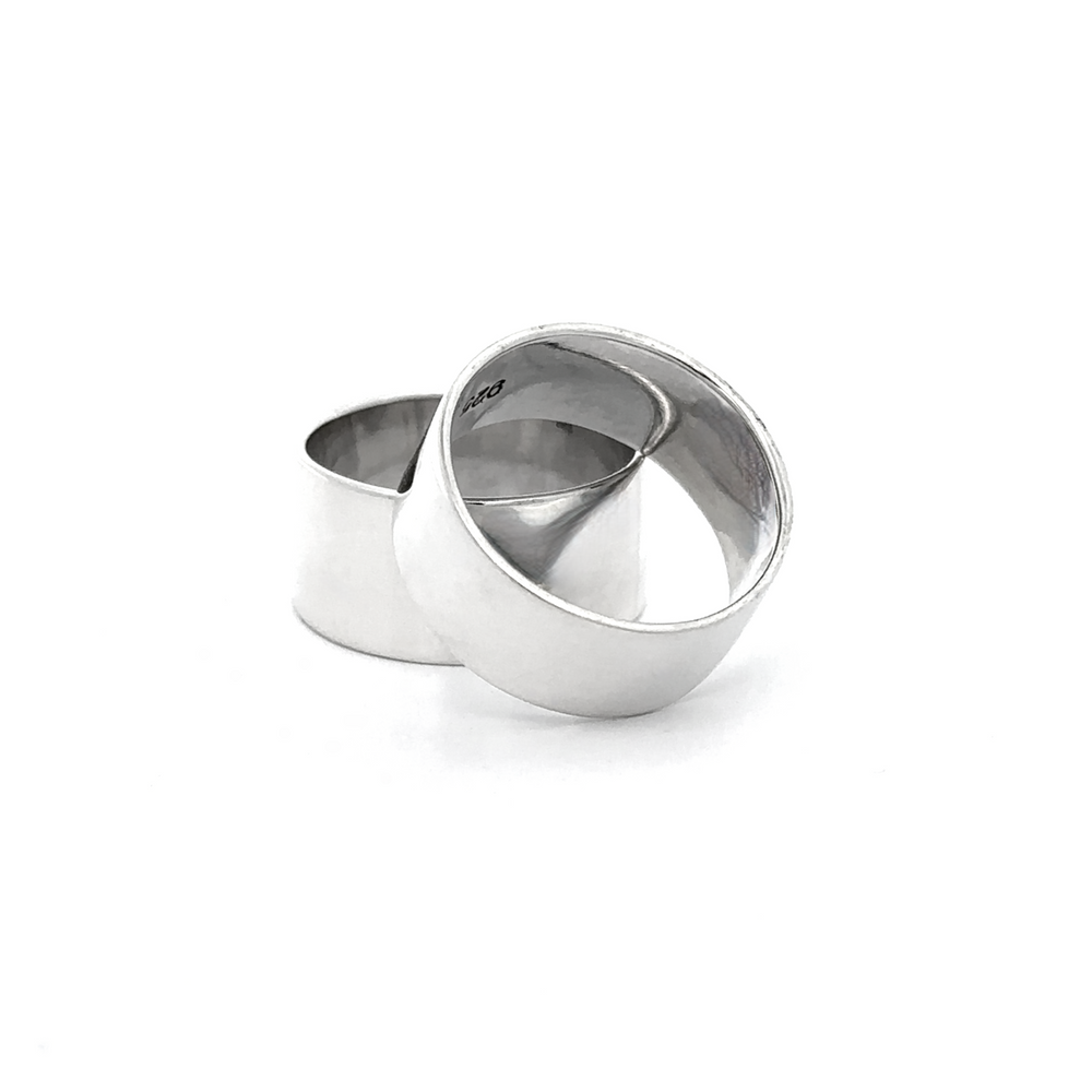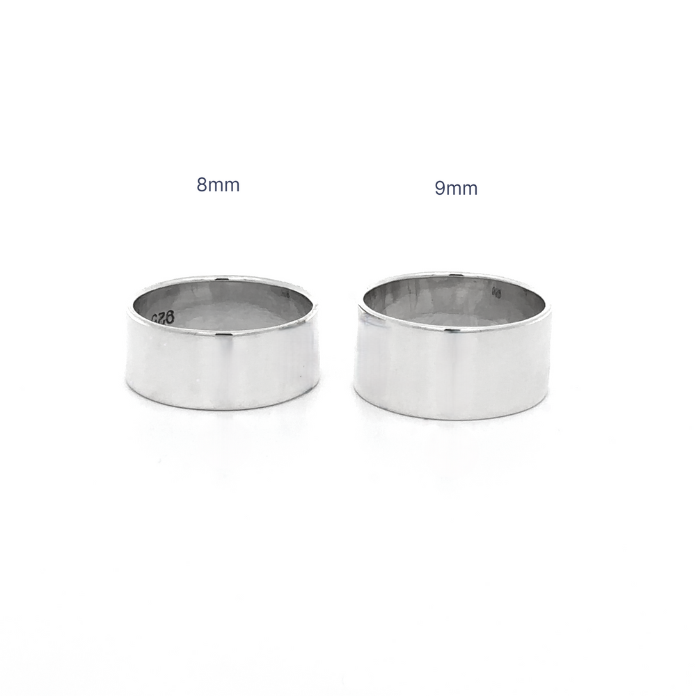 The Flat Band XL features two wide, polished .925 Sterling Silver rings overlapping on a white background, showcasing their bold flat band design and ultra-modern style.Two bold Flat Band XL rings, crafted from .925 Sterling Silver, are shown side by side on a white background, labeled with widths of 8mm and 9mm.