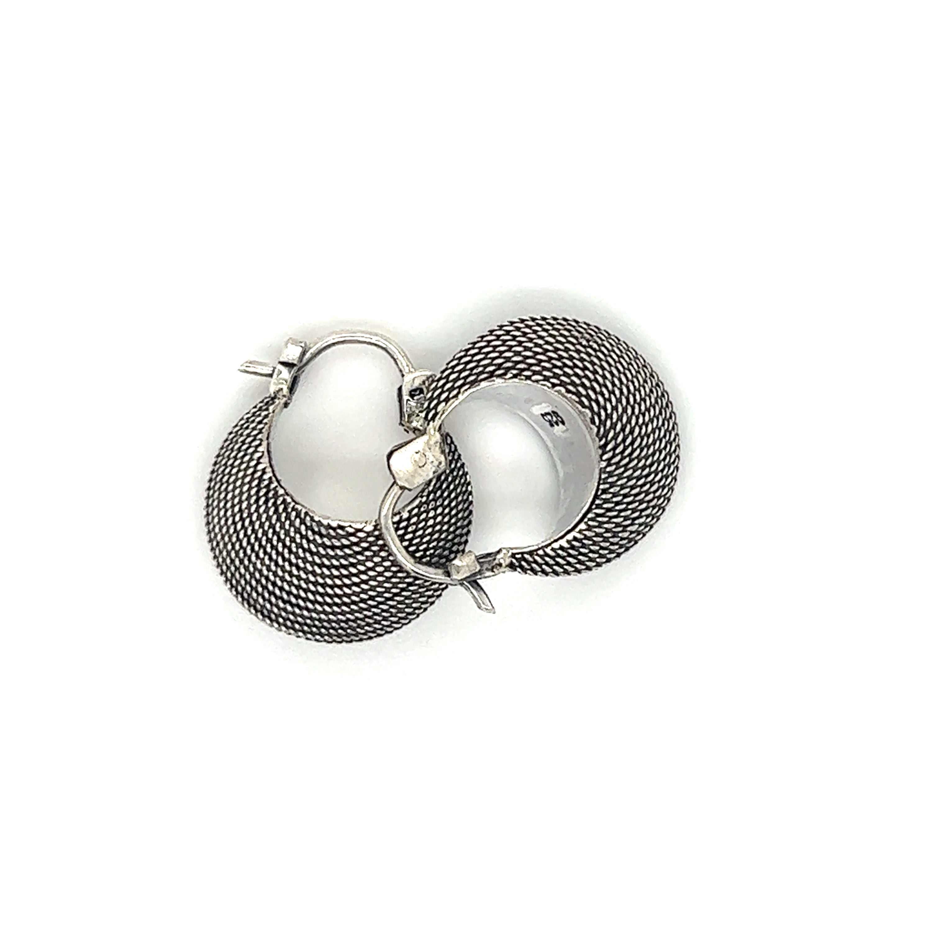 A striking pair of intricately crafted Bali hoops with a distinctive wide curve makes them captivating from every angle. These petite hoops have a woven rope design, accentuated by the oxidized finish, enhancing the elegance of these crescent moon shaped earrings. Lightweight enough for everyday wear but exciting enough for special occasions, these versatile hoops are a fabulous embellishment for every outfit.