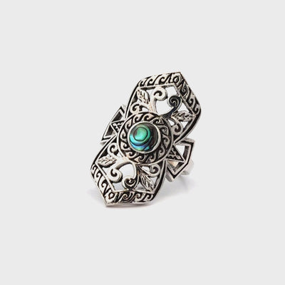 Este intrincado anillo con escudo de filigrana es una pieza llamativa con delicados y refinados volutas de plata y un atractivo detalle de piedra. El amplio diseño de plata envuelve tu dedo y atrae la mirada hacia la brillante piedra central. Disponible en tres hermosos colores para combinar con tu estilo distintivo. Una suave madreperla blanca que brilla al sol y se cree que otorga un aura de calma, que recuerda al abrazo de una madre. Los brillantes verdes azules de la abulón son apreciados por su capacidad de brindar paz y compasión a quien la lleva. O consigue los suaves tonos terrosos de la turquesa que se utilizan para proteger contra la negatividad y equilibrar la energía.