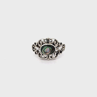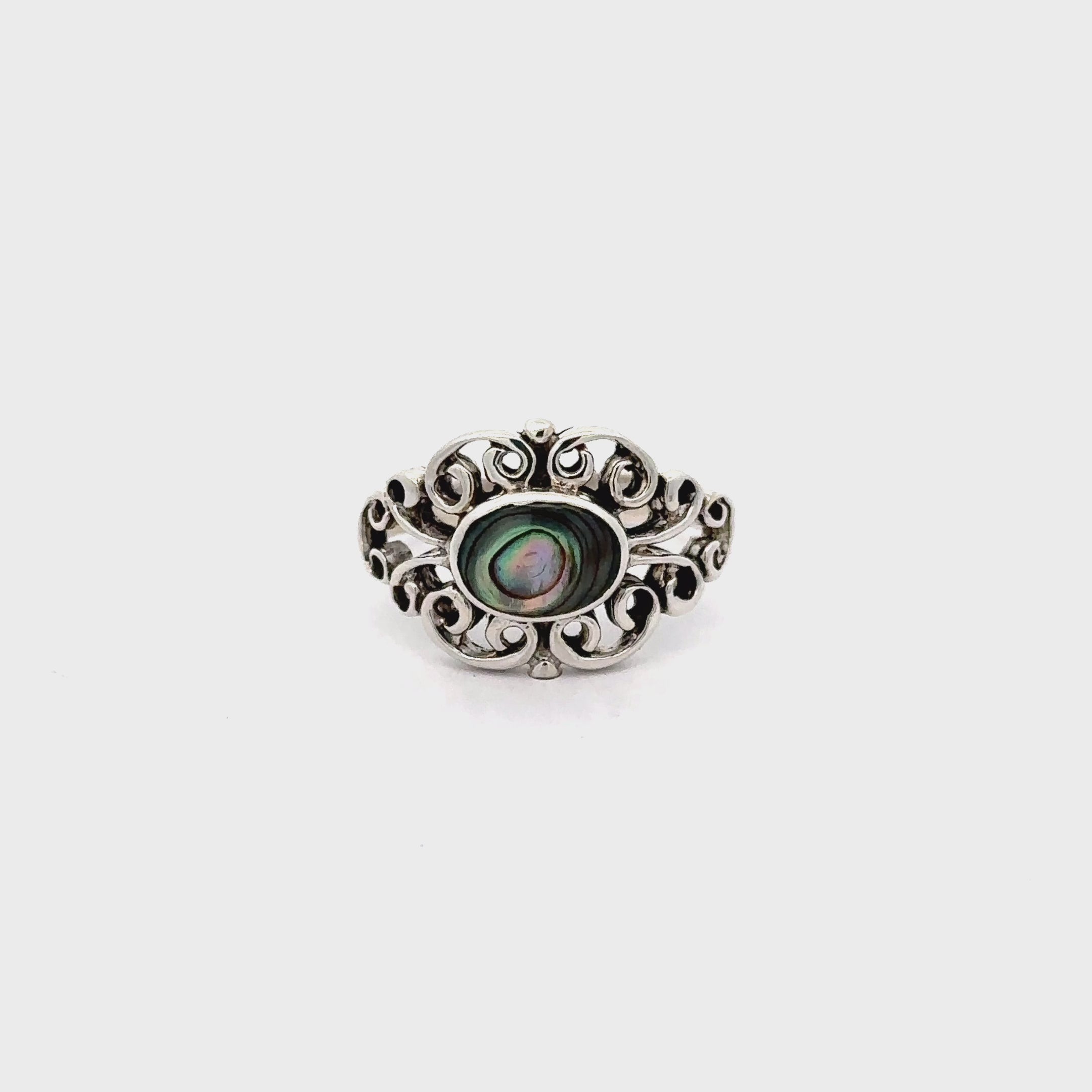 Luce un estilo atemporal con este cautivador anillo que presenta una impresionante piedra ovalada enmarcada con espirales de filigrana de plata. El decadente trabajo en plata hace que este anillo sea un artículo imprescindible para los amantes de lo vintage que buscan un estilo clásico y elegante. Elige entre cuatro magníficas piedras o consigue varias para combinar con tu estado de ánimo. Una suave madreperla blanca que brilla al sol y se cree que otorga un aura de calma que recuerda al abrazo de una madre. Los brillantes tonos azul verdoso del abulón son apreciados por su capacidad de brindar paz y compasión al portador. O consigue los tonos terrosos y suaves del turquesa que se utilizan para proteger contra la negatividad y equilibrar la energía. Añade un toque de misterio con el ónix negro intenso, que antaño se utilizaba en rituales de adivinación y ahora se cree que calma las emociones intensas y limpia las energías.