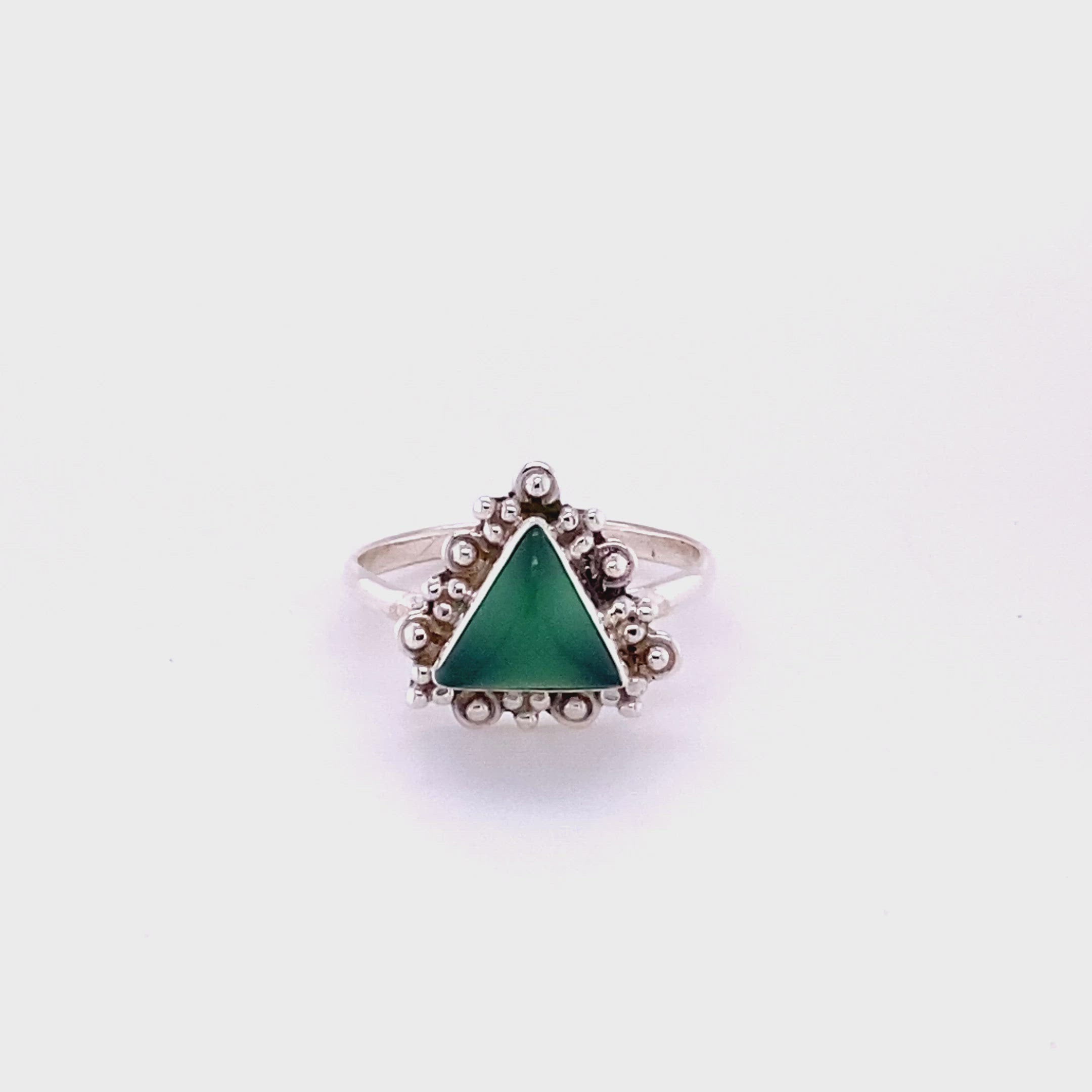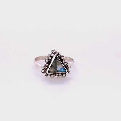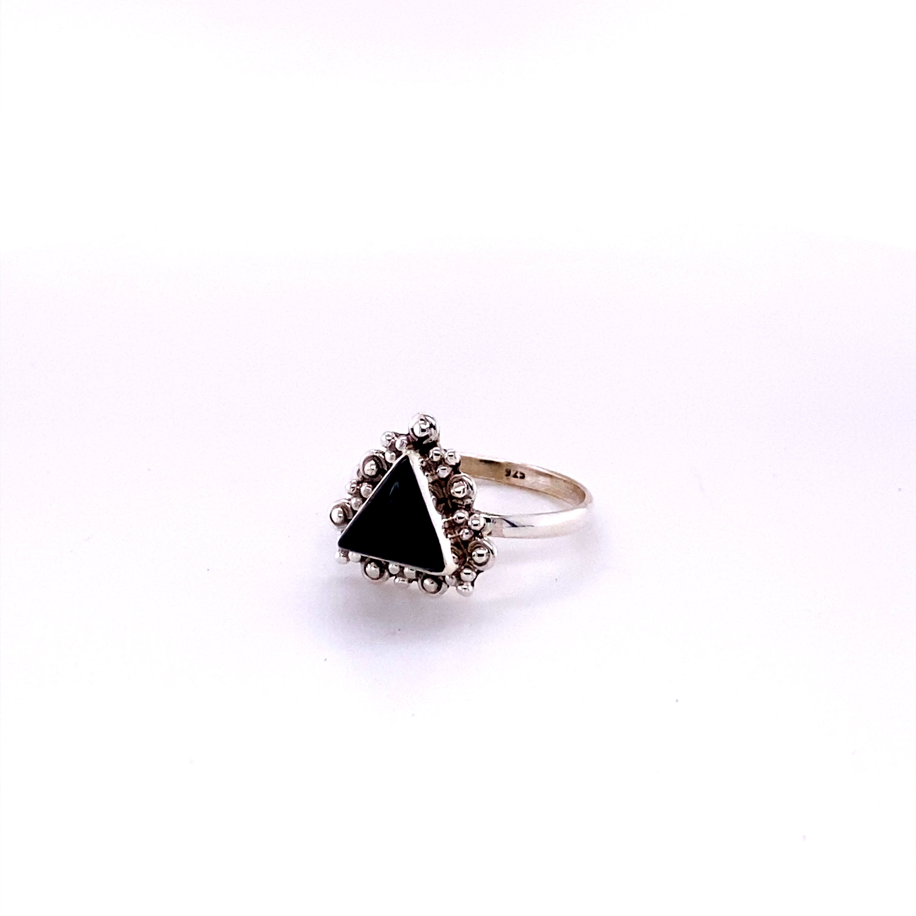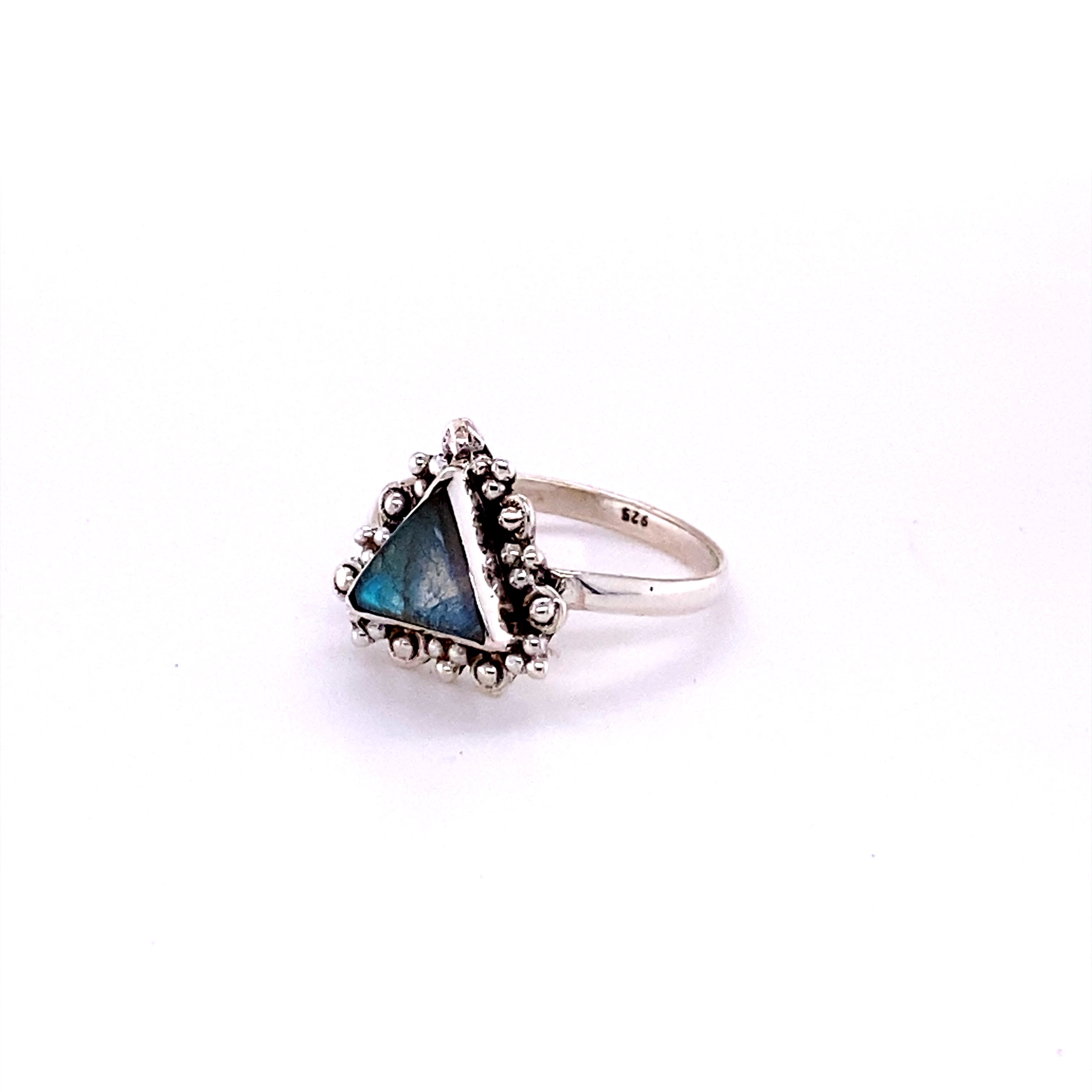 Este delicado anillo con forma de triángulo de piedra preciosa presenta pequeñas cuentas de plata que rodean la piedra, lo que hace que este delicado anillo se destaque.