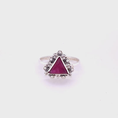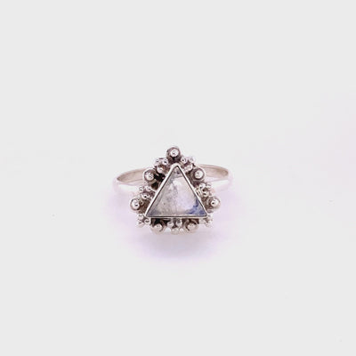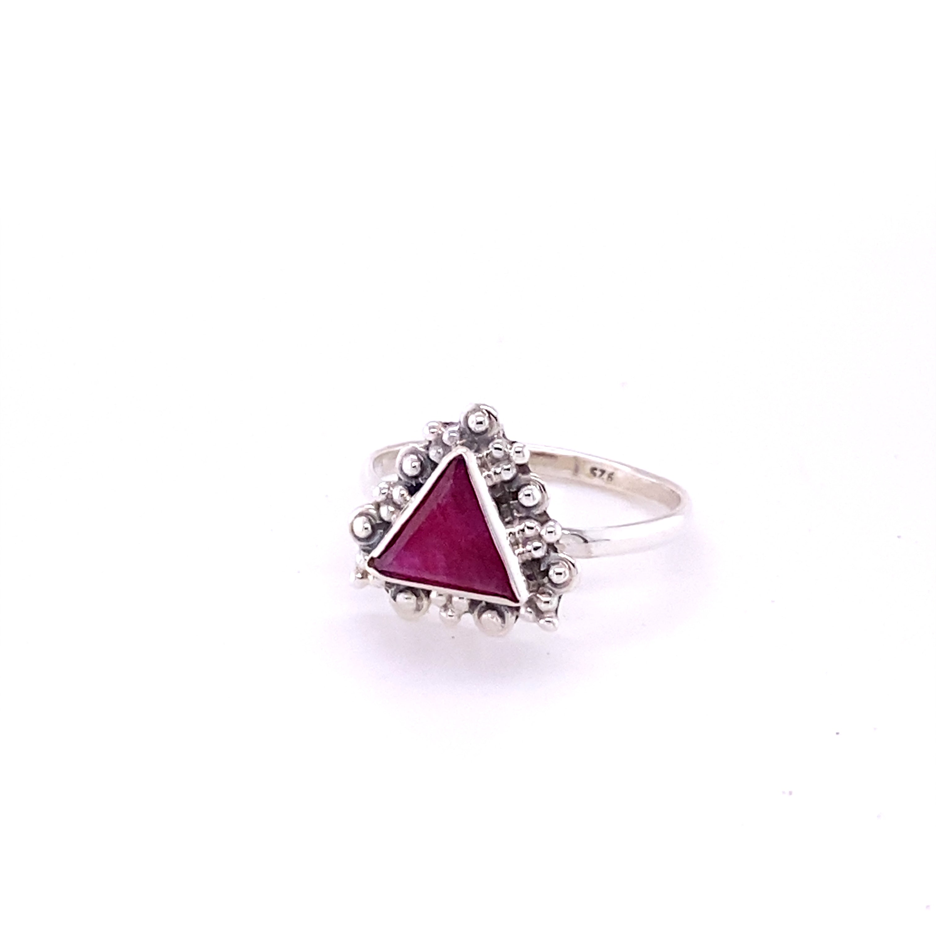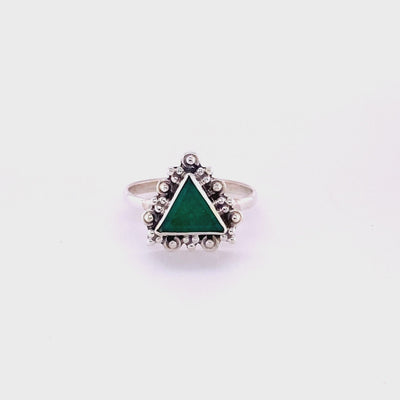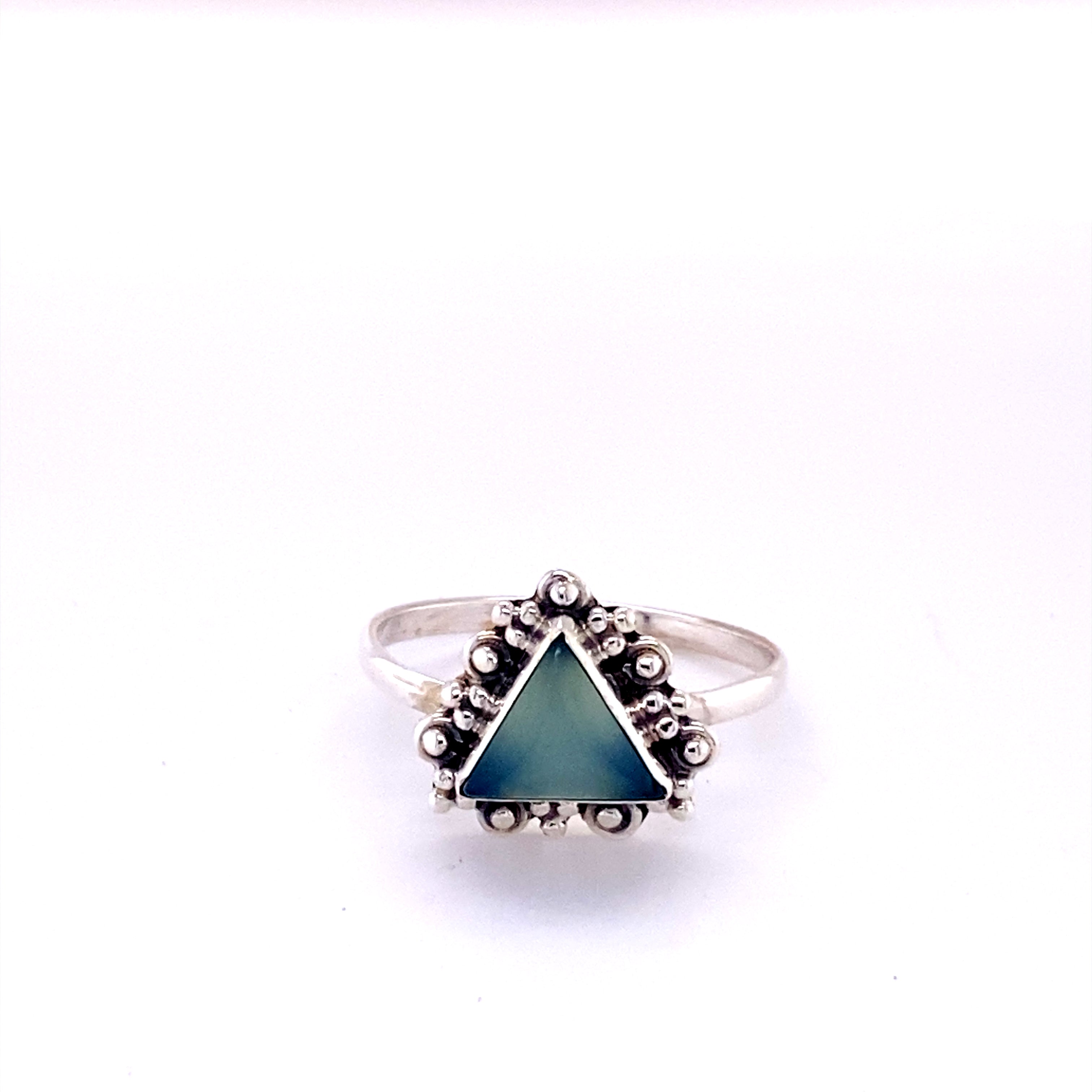 Este delicado anillo con forma de triángulo de piedra preciosa presenta pequeñas cuentas de plata que rodean la piedra, lo que hace que este delicado anillo se destaque.