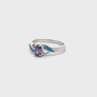 Anillo de ópalo azul con circonita cúbica morada
