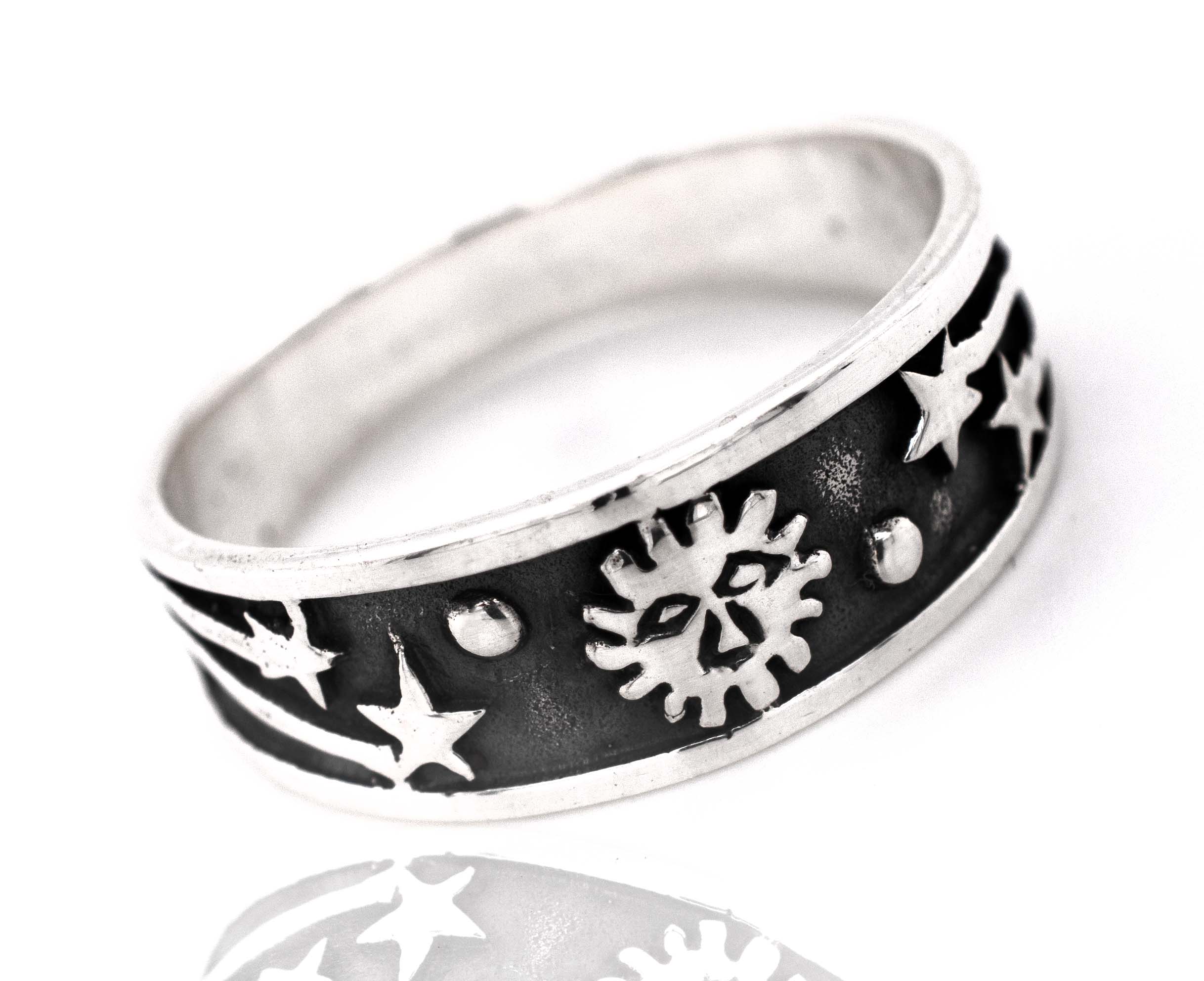 Elegante banda de plata esterlina con diseño de galaxia psicodélica y patrón de estrellas fugaces en un marco oxidado. Esta banda es perfecta para temas festivos o uso diario.