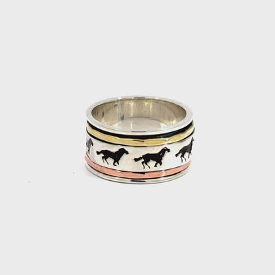 Anillo giratorio hecho a mano con caballo grabado en la banda
