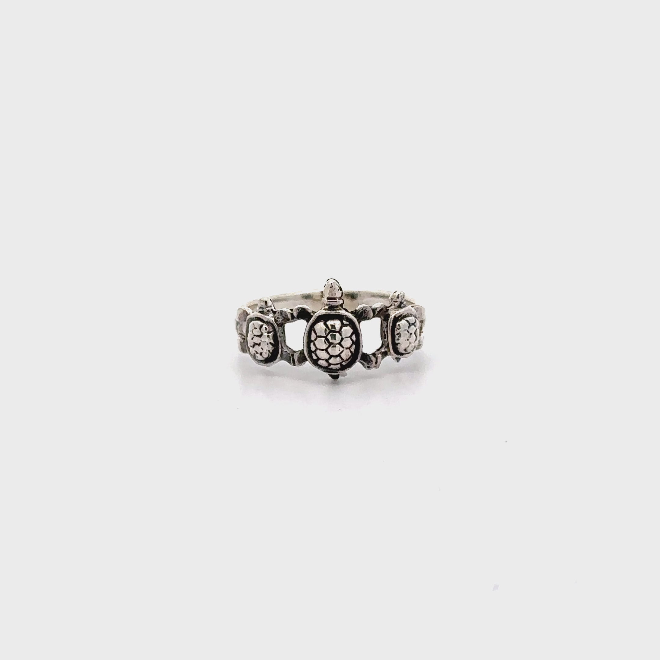 Hermoso anillo con una tortuga grande y dos pequeñas verticales a lo largo de la banda.