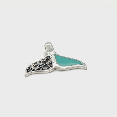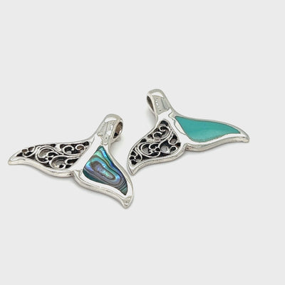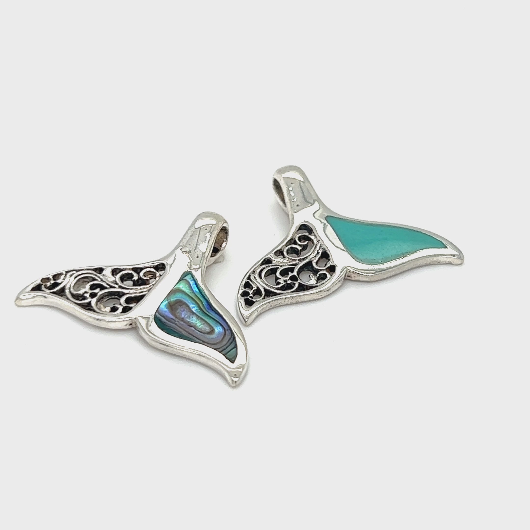 Sumérgete en la serena belleza de nuestro colgante de cola de ballena con incrustaciones de piedra, una celebración de las inmensas maravillas del océano y los gentiles gigantes que lo habitan. La mitad de este cautivador colgante muestra los intrincados patrones de filigrana, que reflejan la delicada danza de las olas en un día tranquilo. La otra mitad contiene una gema de abulón o turquesa, un guiño a la vibrante e iridiscente vida debajo de la superficie.