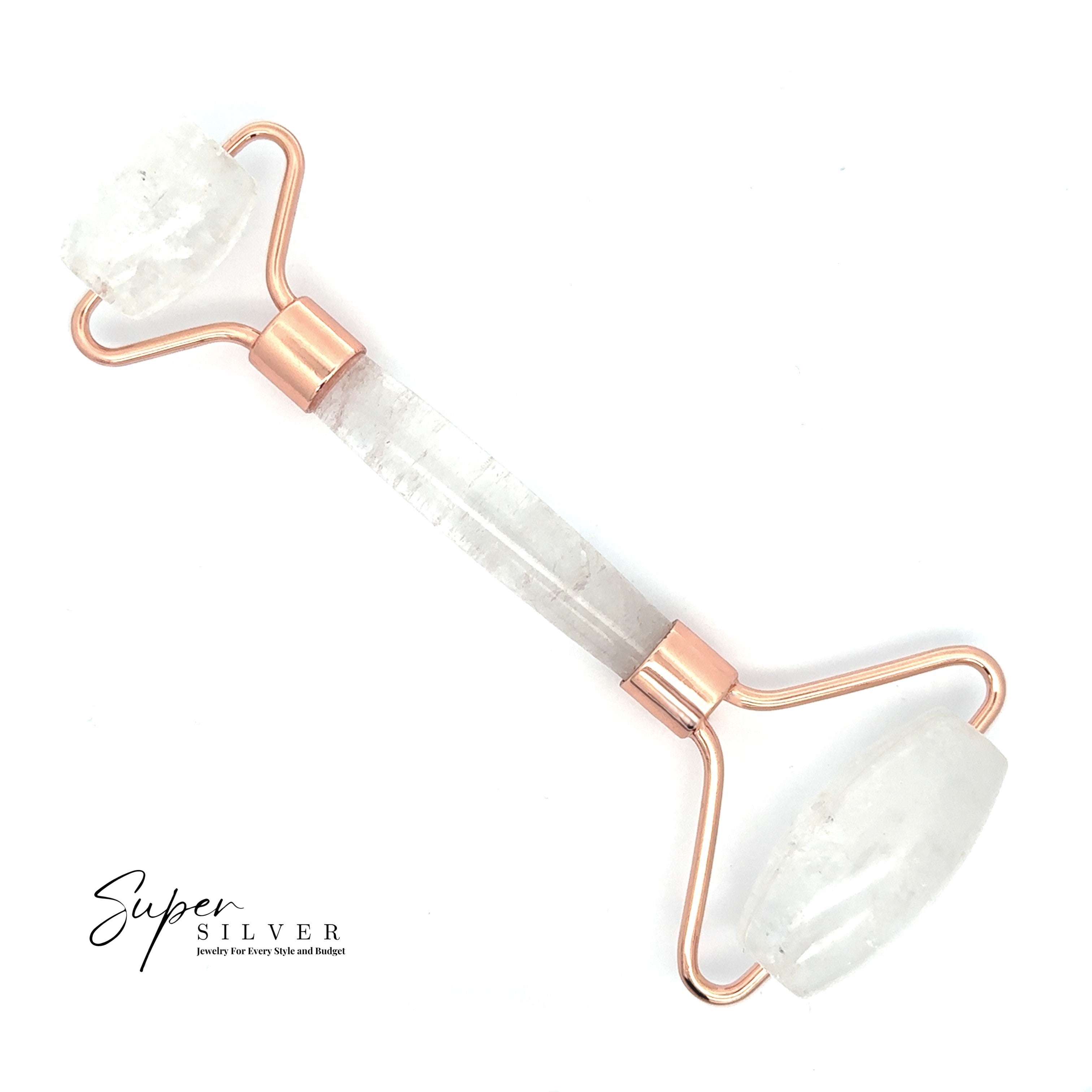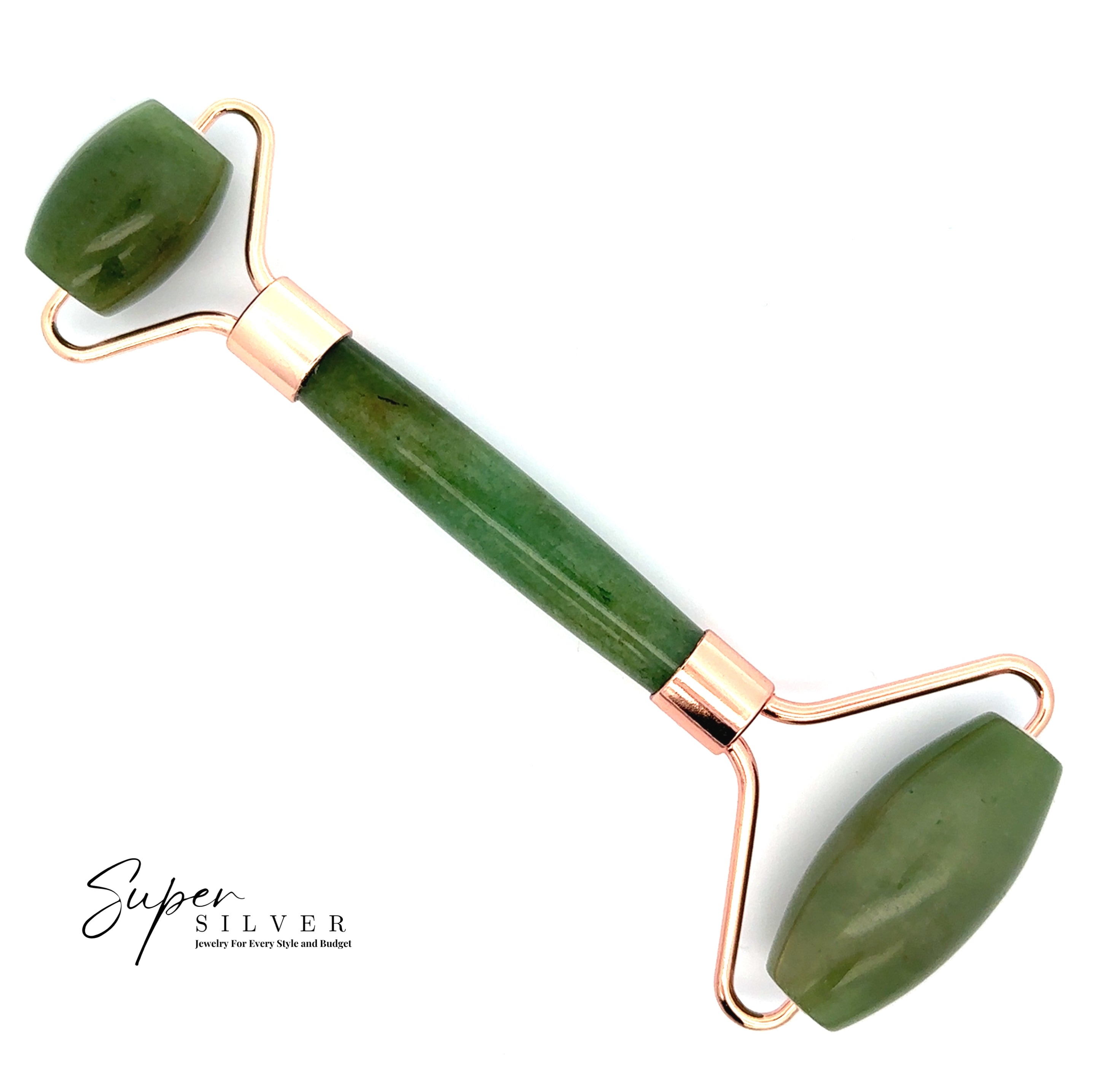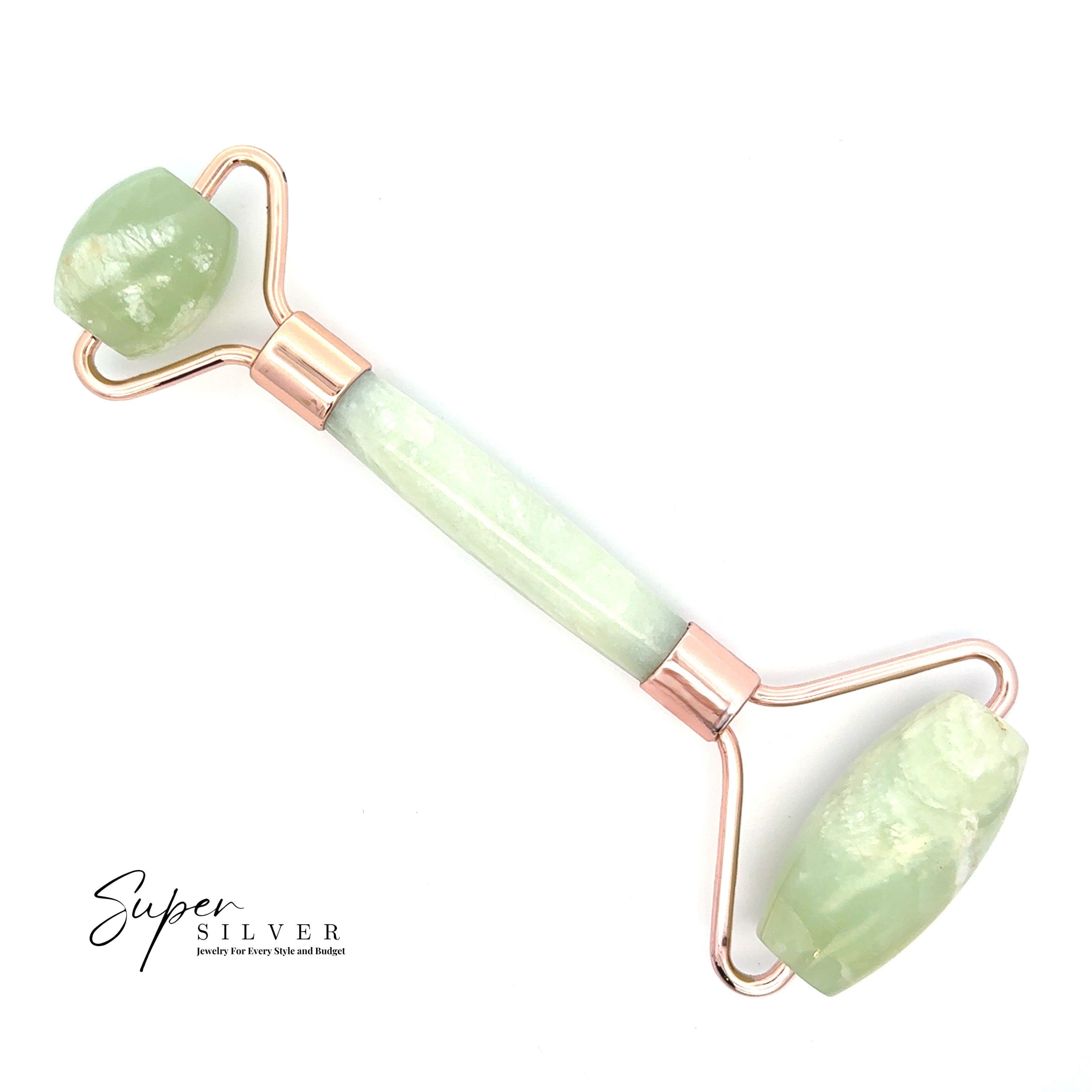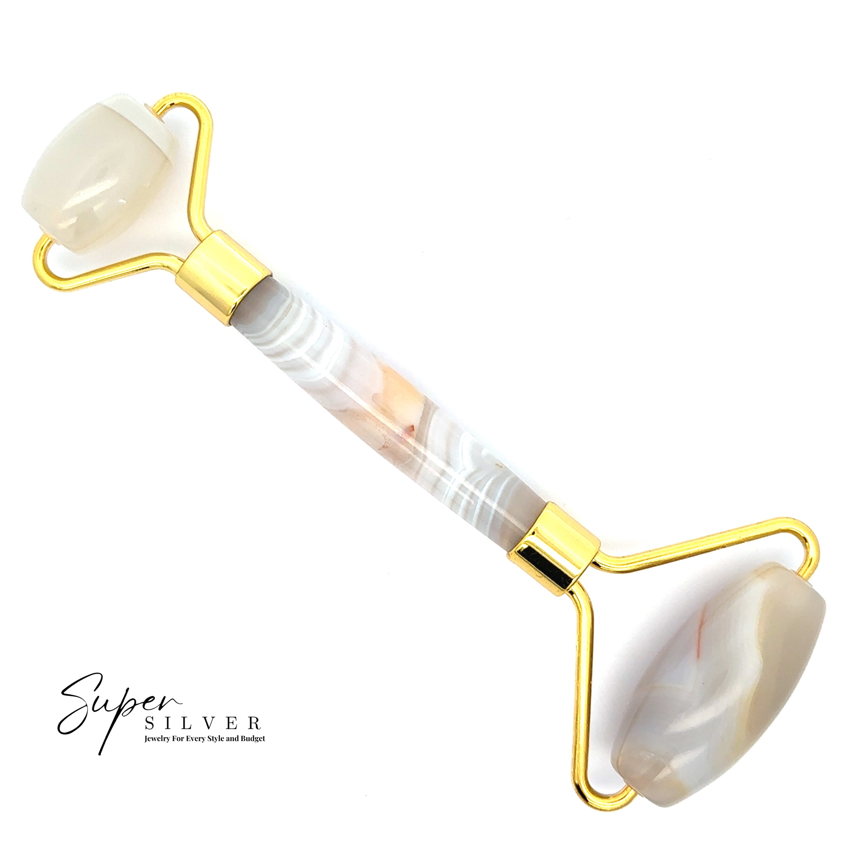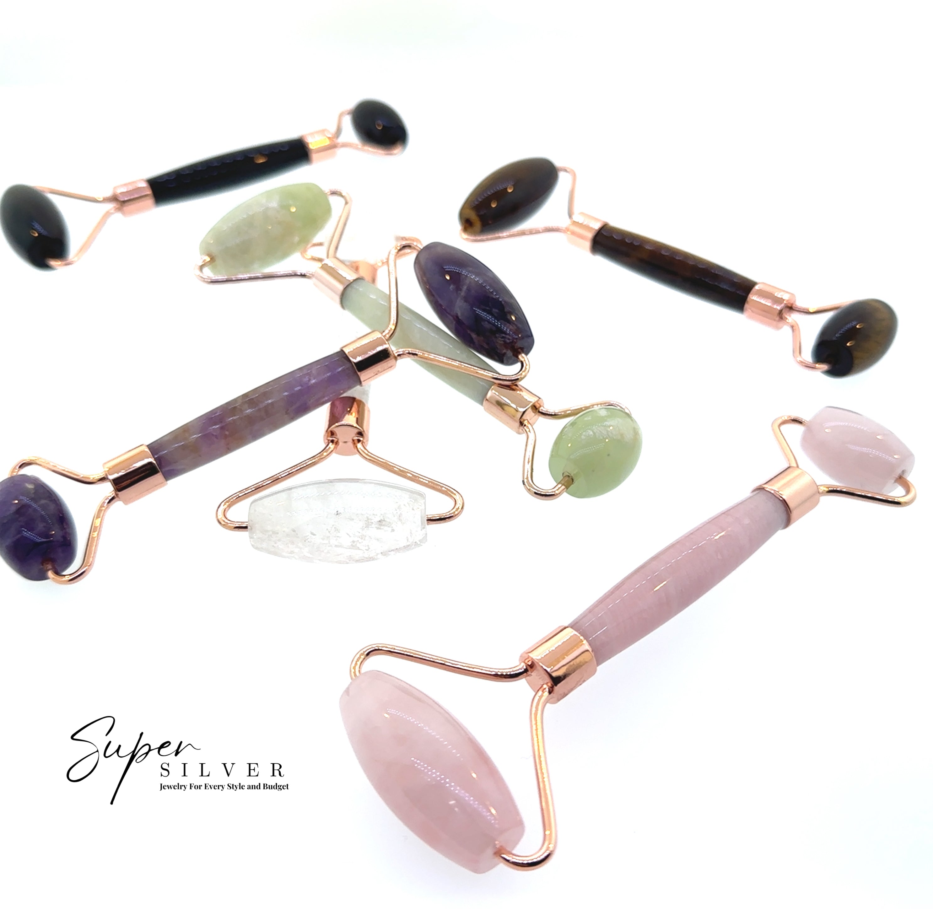Stone Face-Rollers: A dual-ended gemstone roller with a gold frame and smooth stone rollers, displayed on a white background with "Super Silver" branding—a stylish upgrade for any skincare routine.