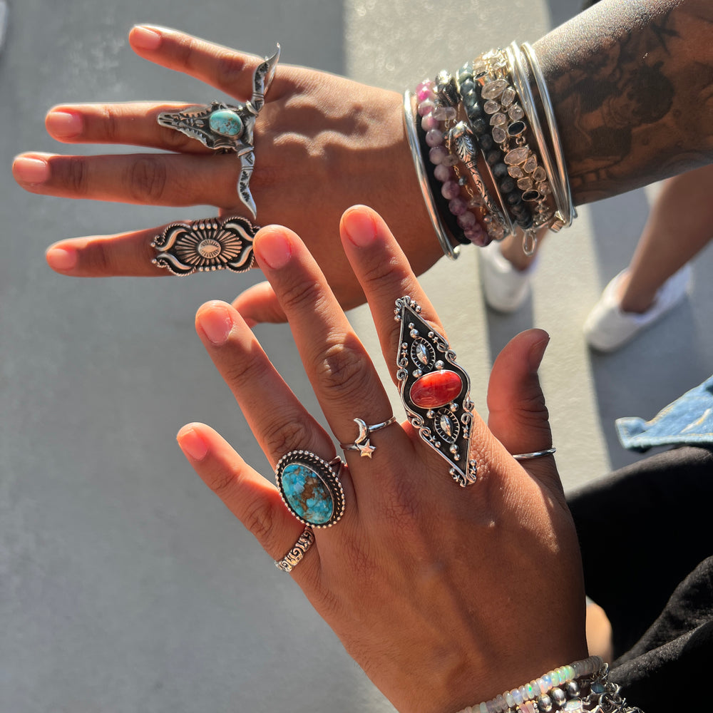Plongez-vous dans l'éclat du Sud-Ouest avec notre captivante bague amérindienne. Cette magnifique pièce incarne l'essence de l'art amérindien, mettant en valeur un savoir-faire et un flair artistique époustouflants. Disponible en turquoise ou en corail, chaque bague témoigne des traditions vibrantes et du patrimoine culturel du Sud-Ouest. La finition oxydée ajoute un charme rustique, rehaussant son allure et créant un attrait unique. Avec des extrémités pointues de chaque côté, cette bague devient une véritable pièce maîtresse qui ose faire tourner les têtes et se démarquer. Portez-le fièrement comme une œuvre d'art à la main, où vous pourrez ressentir le charme de la terre et percer les secrets du désert. Laissez le savoir-faire de cette superbe bague en dire long car elle capture la beauté émouvante de l'artisanat amérindien.