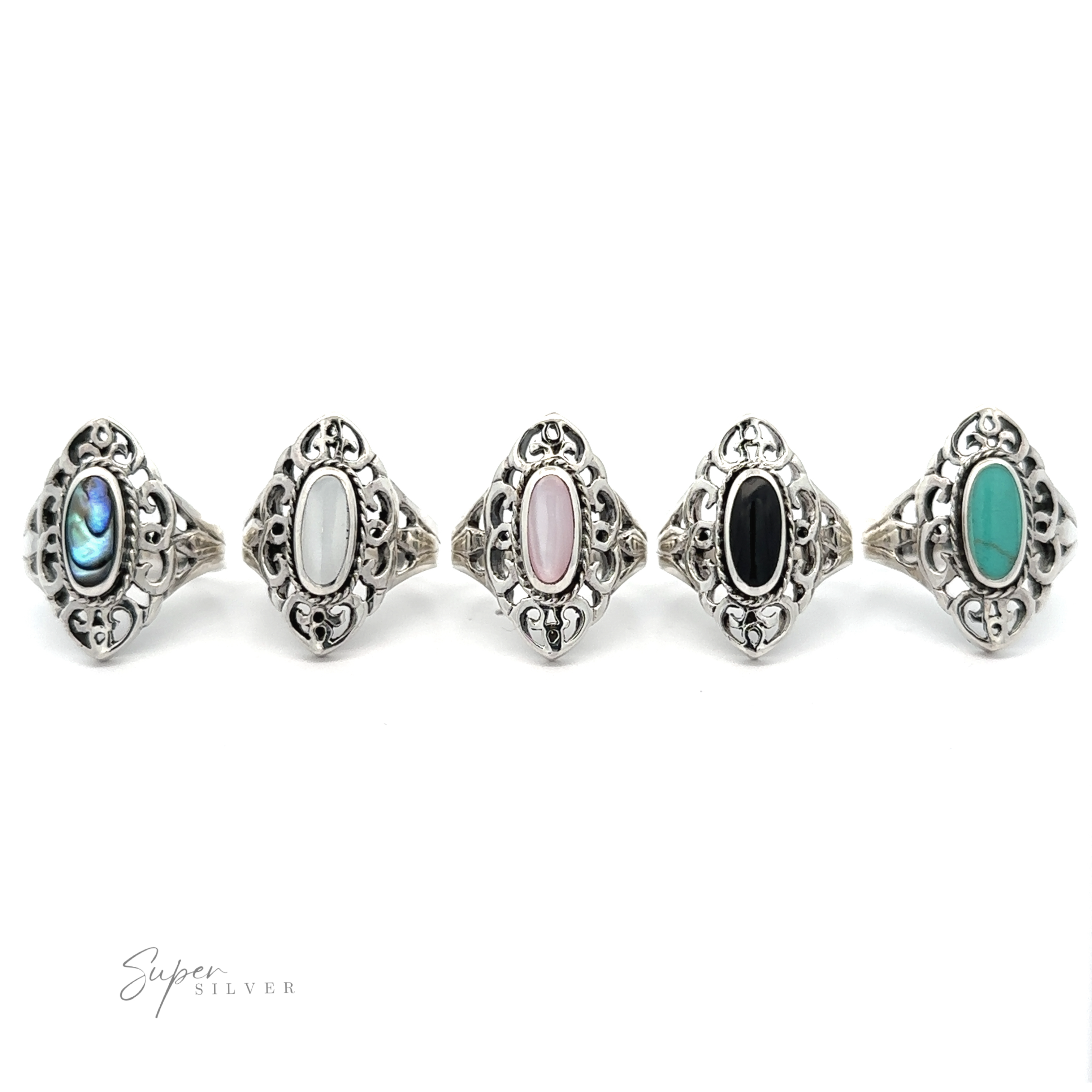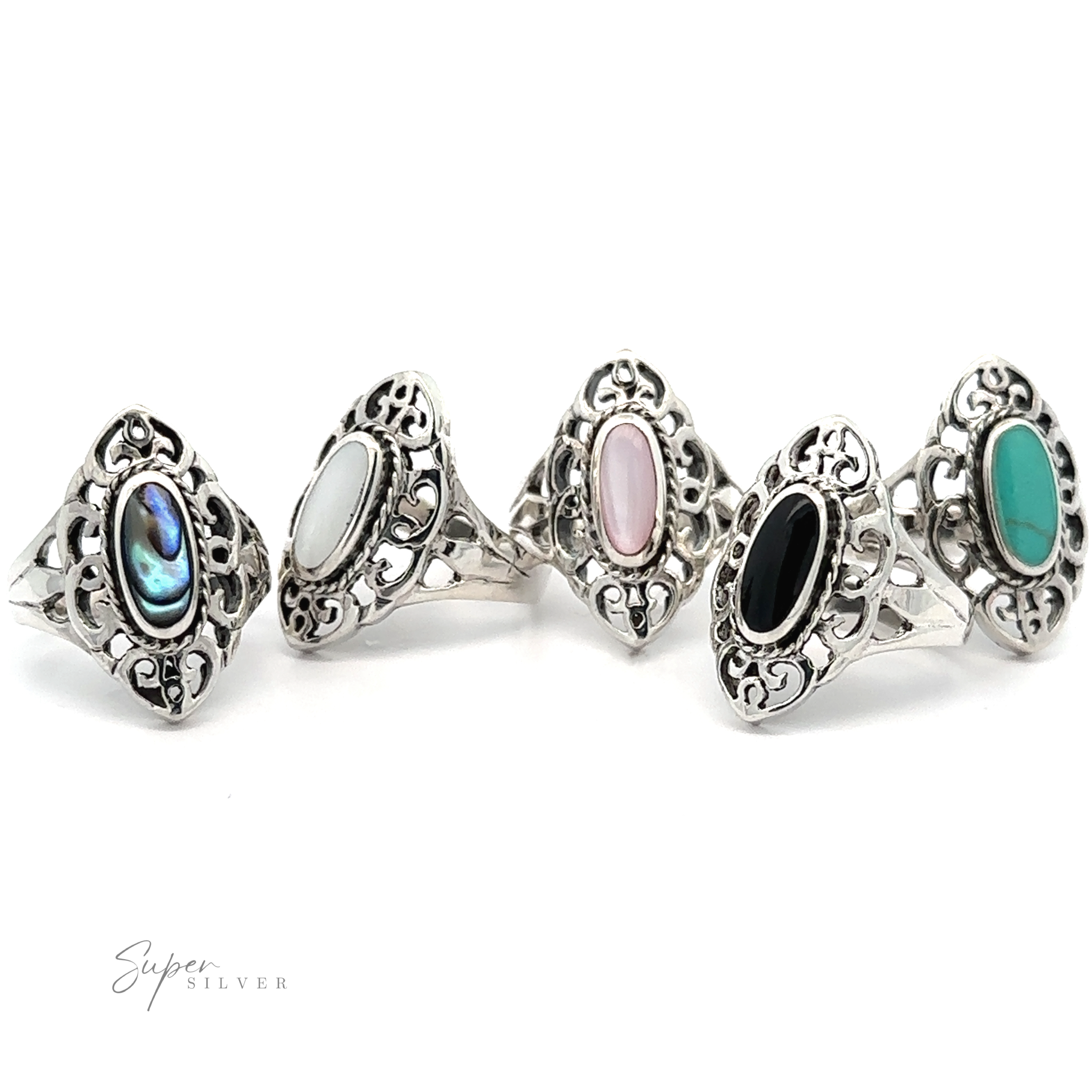 Bague ovale horizontale avec pierre précieuse et bande perlée