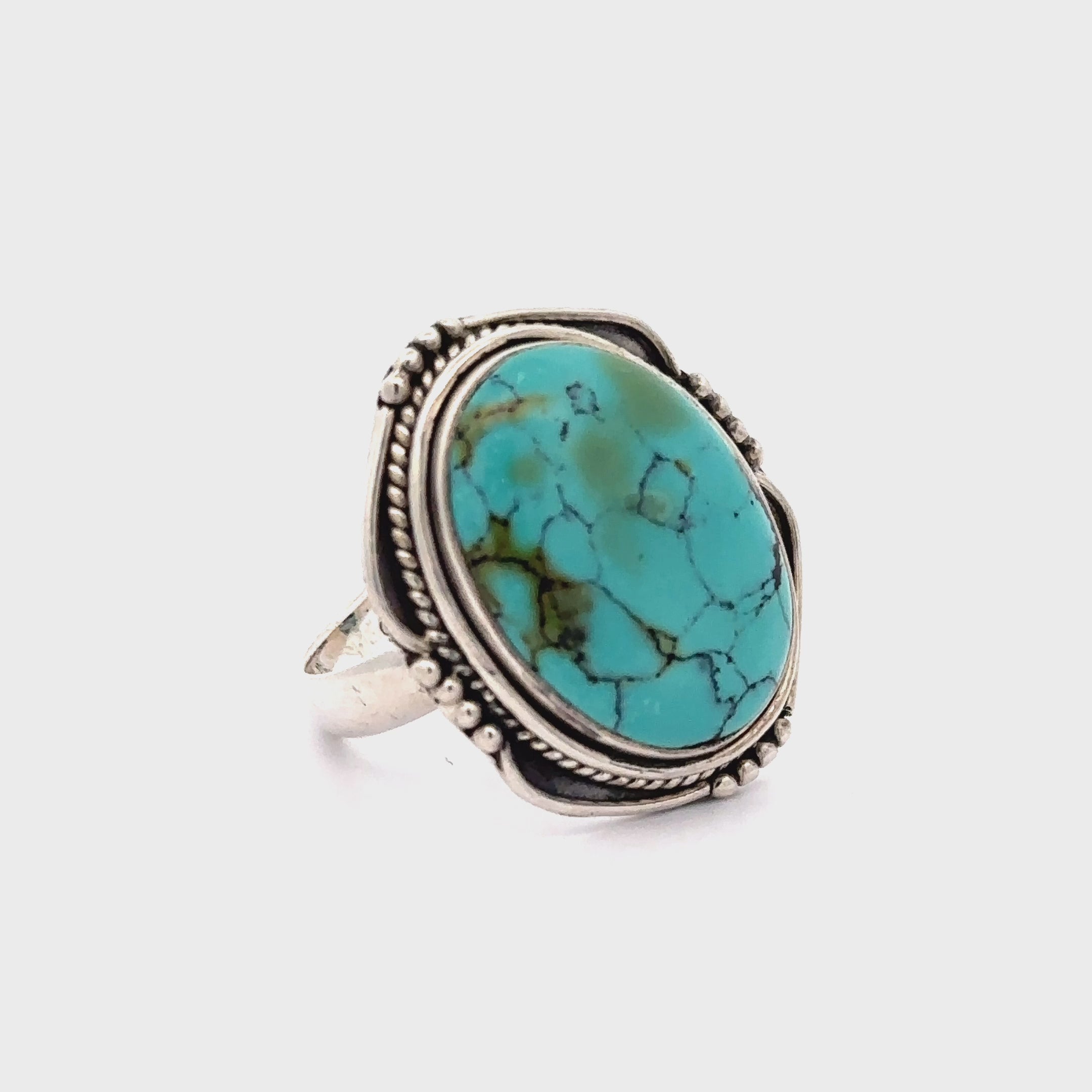 Belle et vibrante turquoise naturelle de forme ovale sertie dans un élégant cadre en argent sterling.