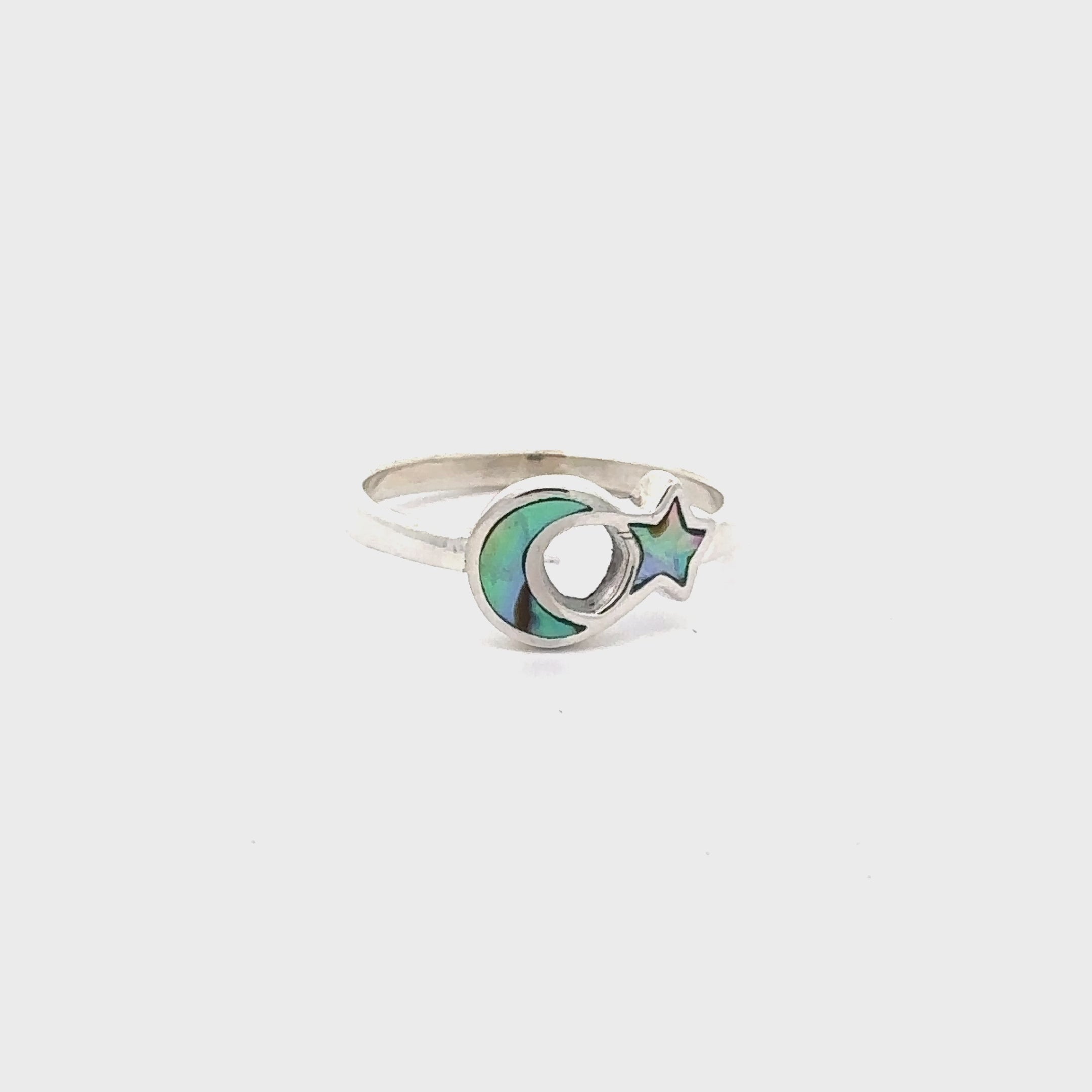La populaire bague croissant de lune et étoile avec pierres incrustées est un incontournable. Super confortable et idéal à porter au quotidien, offert dans diverses pierres, notamment l'ormeau, la nacre, l'onyx reconstitué et la turquoise.