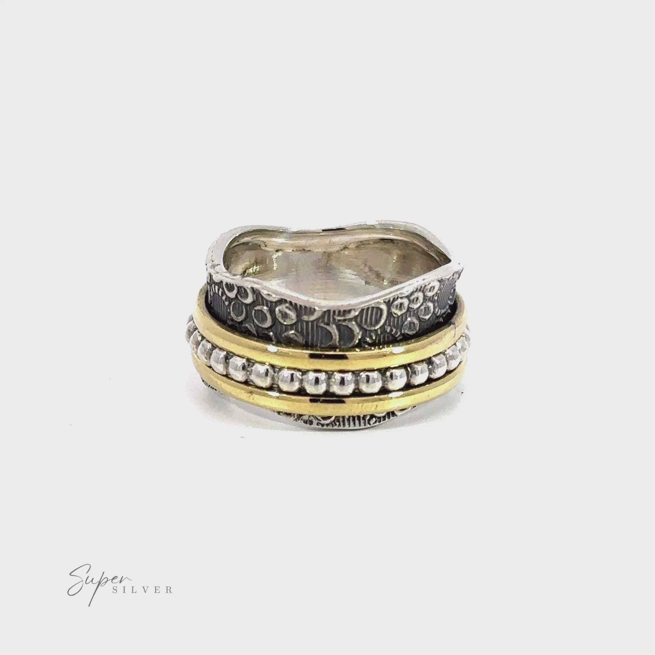 Bague spinner magnifiquement faite à la main. La monture de la bague ressemble à une texture de pieuvre avec 2 bandes dorées et une bande argentée en forme de boule au milieu. Tres unique.