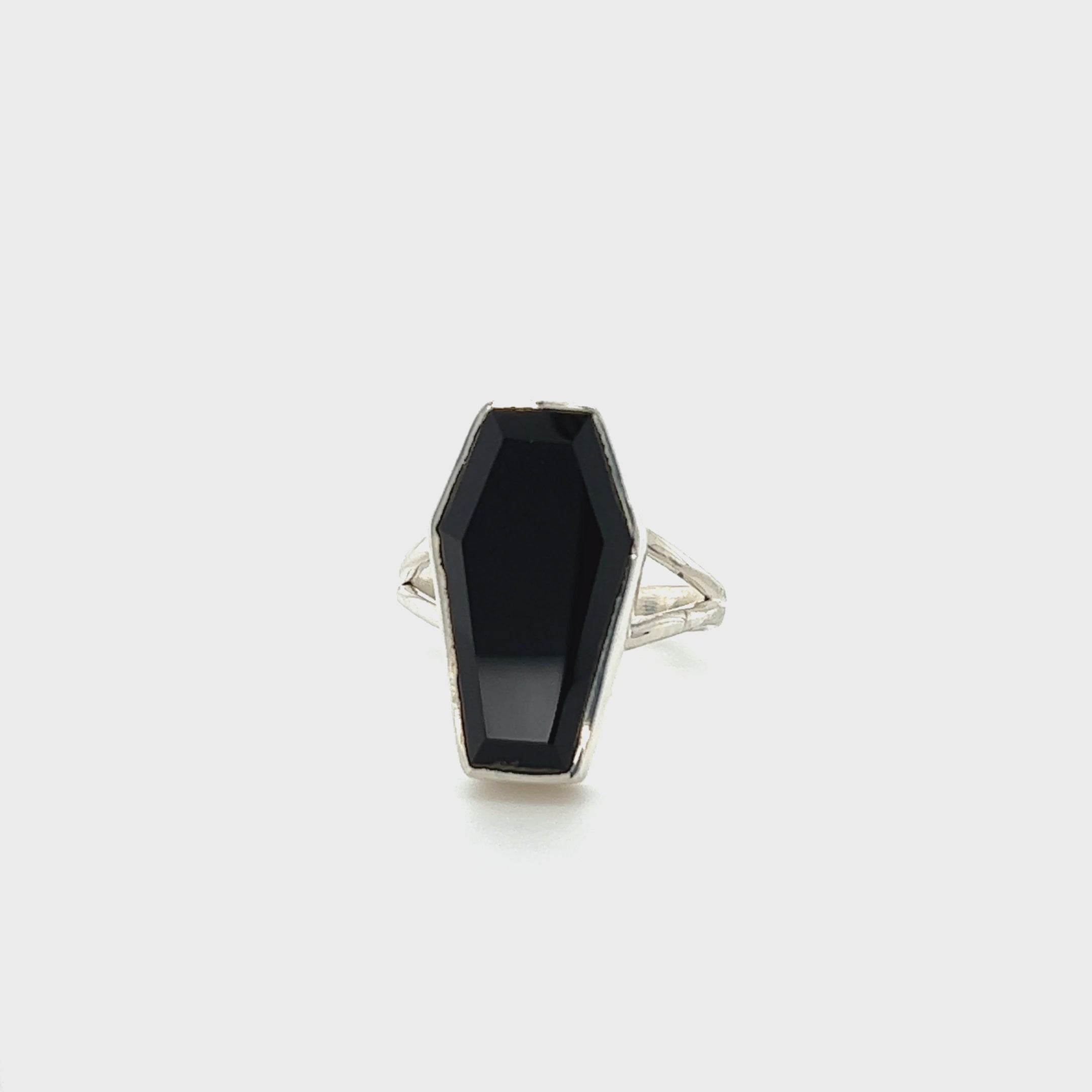 Embrassez l'étrange et le mystérieux avec notre bague cercueil en onyx à facettes. Cette bague dégage un sentiment de mystique gothique, invoquant un sens captivant de l'effrayant et du macabre. La pierre d'onyx à facettes, ressemblant à un cercueil miniature, est un symbole puissant des complexités, des transitions et des mystères de la vie qui se cachent au-delà. Porter cette bague ne fait pas seulement une déclaration ; c'est embrasser l'obscurité et célébrer le talent artistique des ombres. C'est une œuvre d'art gothique portable qui vous invite à explorer les profondeurs de votre propre style et la beauté énigmatique de la nuit. Que vous soyez attiré par l'étrange, l'effrayant ou que vous appréciiez simplement le sombre et romantique, cette bague est votre invitation à faire une déclaration audacieuse et à dégager un air de sophistication mystérieuse. Entrez dans l'ombre et laissez votre style parler de lui-même avec cette pièce captivante et distinctive.