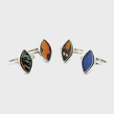Vivez la métamorphose magique de la nature avec nos véritables bagues en forme d'aile de papillon, présentant la séduisante forme de marquise. Provenant de manière durable de la luxuriante Amazonie péruvienne, ces bagues uniques en leur genre mettent en valeur les motifs complexes et la beauté vibrante des ailes de papillon. En portant ces créations uniques, non seulement vous vous parez d'une élégance éthérée, mais vous contribuez également à la conservation de ces magnifiques créatures et de leurs habitats naturels de forêt tropicale. Entrez dans le monde de la mode durable, où chaque bague raconte une histoire de beauté, d'harmonie et de conscience environnementale.