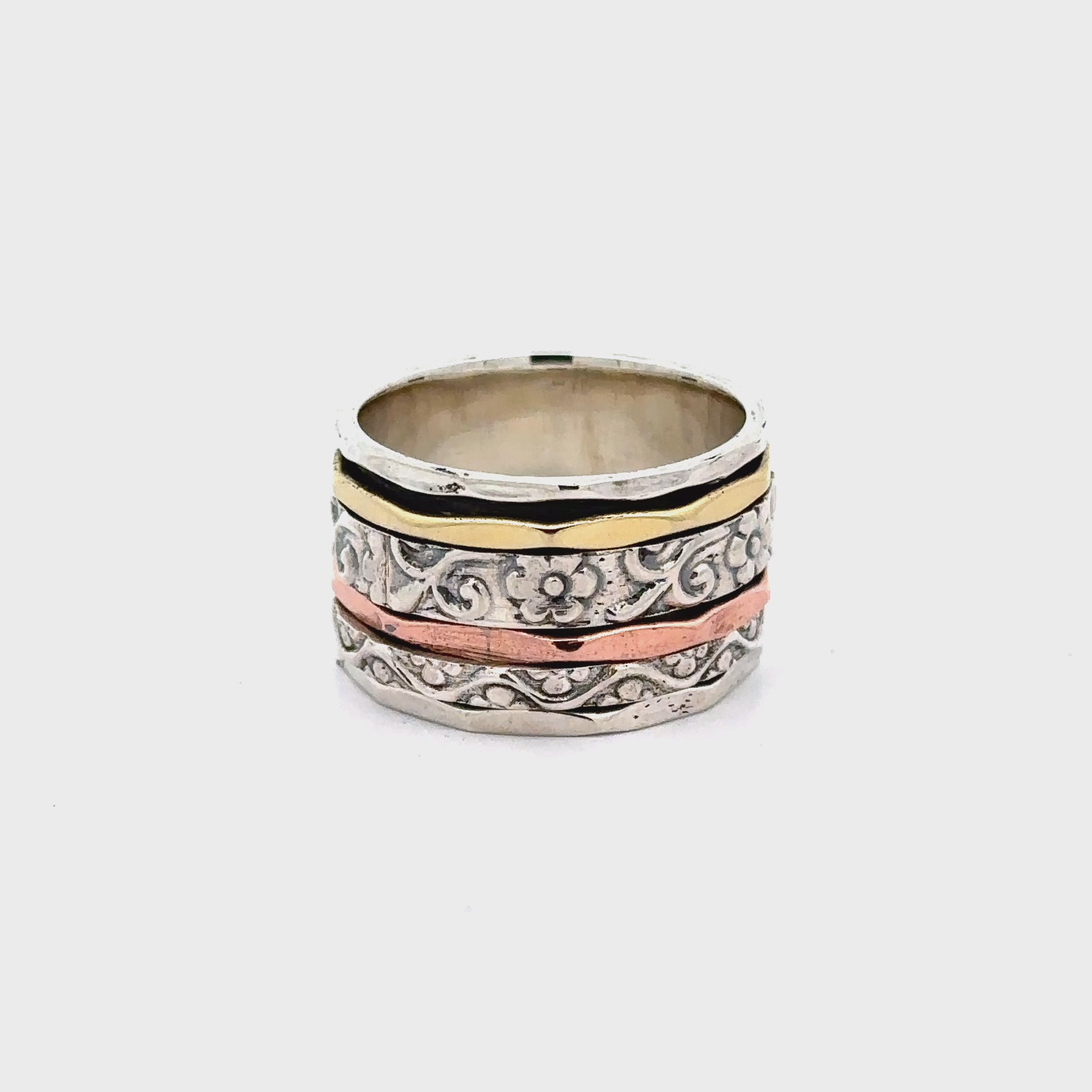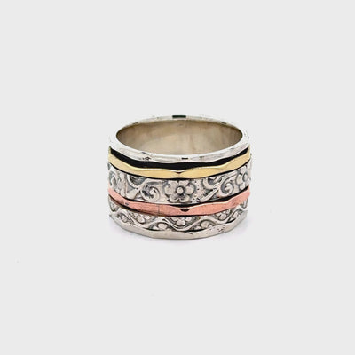 Une bague spinner unique faite à la main avec des bandes d’or et de cuivre. De magnifiques fleurs sont gravées sur les bandes pour accentuer cette œuvre d'art.