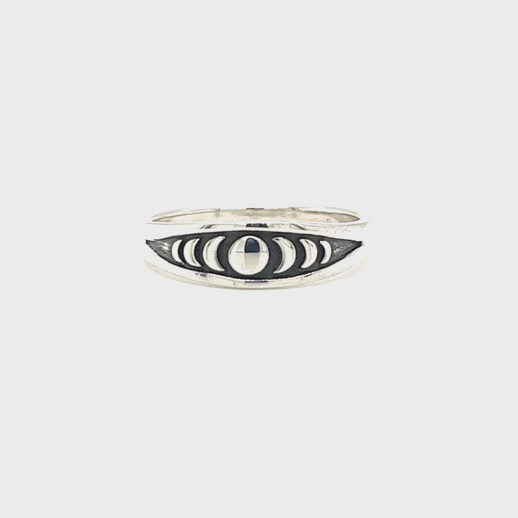 Embrassez la beauté captivante de la lune avec cette bague de phase de lune unique. Les faces argentées du cycle lunaire brillent brillamment sur le fond sombre et oxydé. Symbolisant l'harmonie, la transformation et la sagesse féminine, la lune sert de talisman qui nous relie à notre propre pouvoir magique. Avec son design effilé élégant et sa signification mystique, cette superbe bague résume l'attrait mystérieux du royaume céleste.