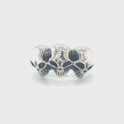 Provoquez des frissons avec cette bague triple tête de mort qui fait frissonner la colonne vertébrale. Cette bague audacieuse est une pièce maîtresse idéale pour toute tenue méchante et dure. Avec un design épais et robuste, cette bague deviendra certainement un favori au quotidien.