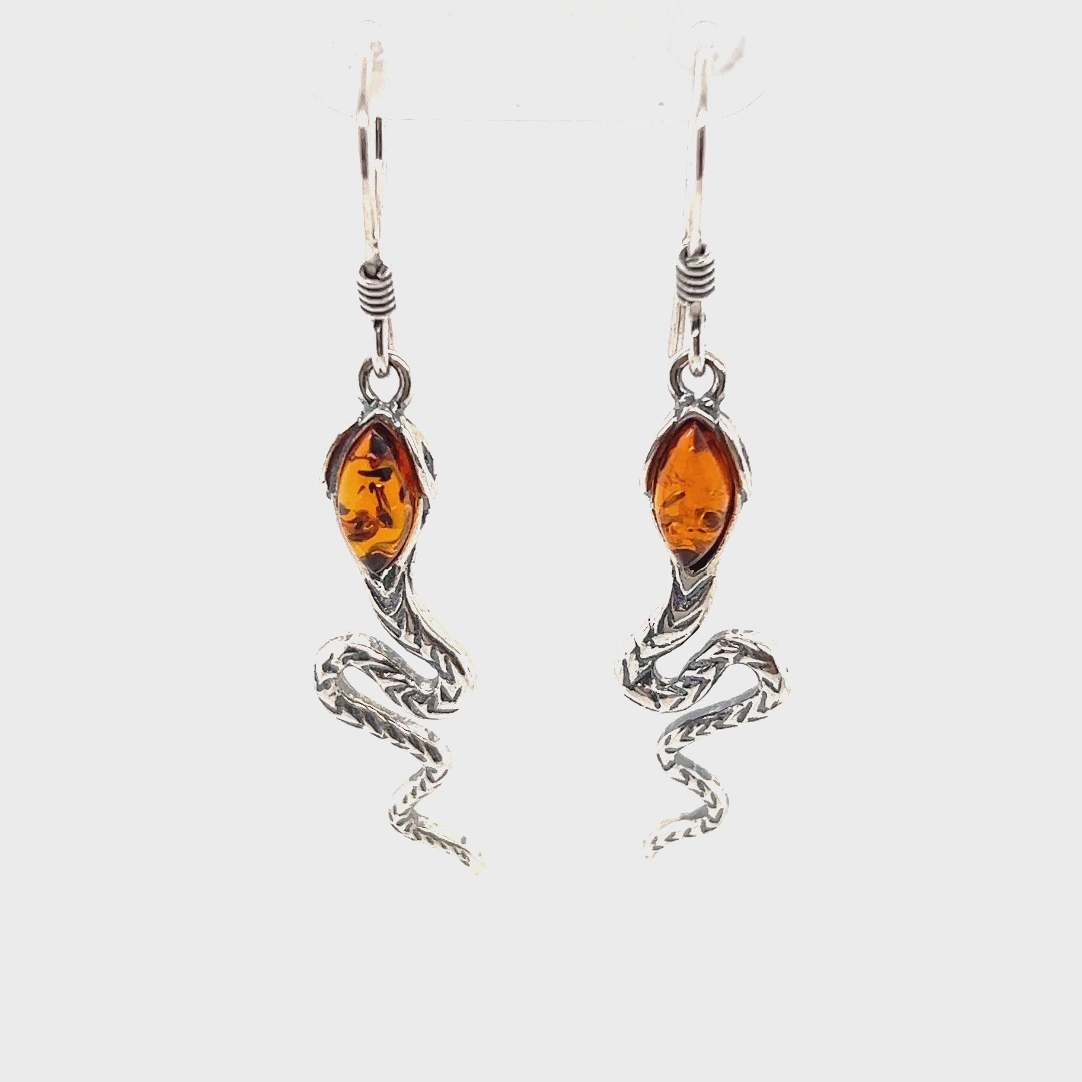 These enchanting Baltic amber snake earrings shimmer with their long serpentine swirling tail. These dainty earrings have a spellbinding vibe while captivating you with the deep cognac amber's glow. Snakes symbolize rebirth, eternity, and fertility; these shifting serpents have fascinated people for millennia. Anchored in the luminous beauty of amber, this mesmerizing stone is known to promote calmness, self-confidence, and self-empowerment by grounding you in its ancient sap. So let these magical friends of witches slither into your heart and onto your ears!