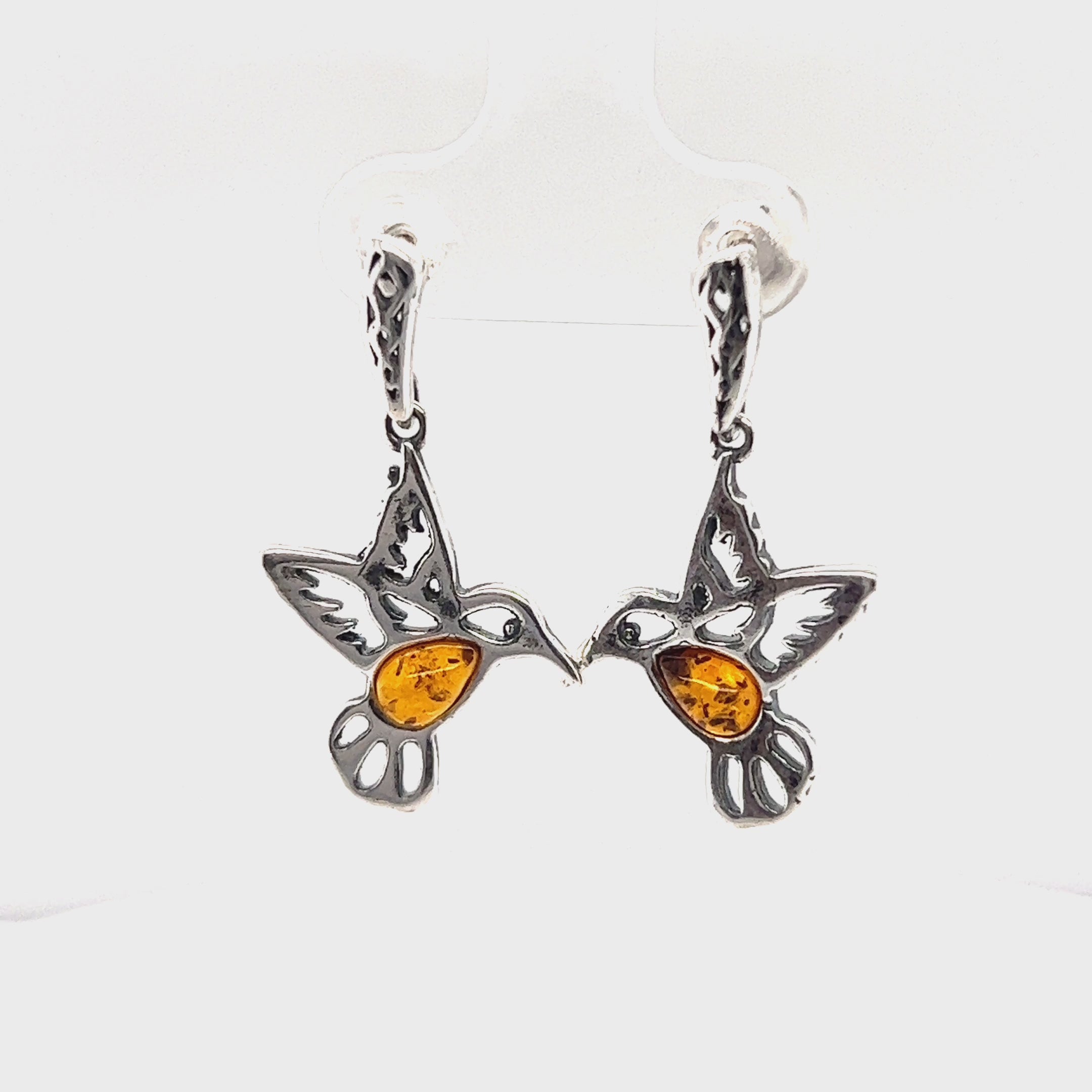 A captivating display of the mystical hummingbird adorned with the supple, rich honey glow of amber. These dainty and charming earrings are rich in earthy appeal. The tiny fliers are believed to be messengers of good luck and healing and are thought to be a sign that a loved one's spirit is near. This elegant pair of earrings is rich in luck, healing, love, and nature's beauty. Pair with the matching pendant for a stunning set.