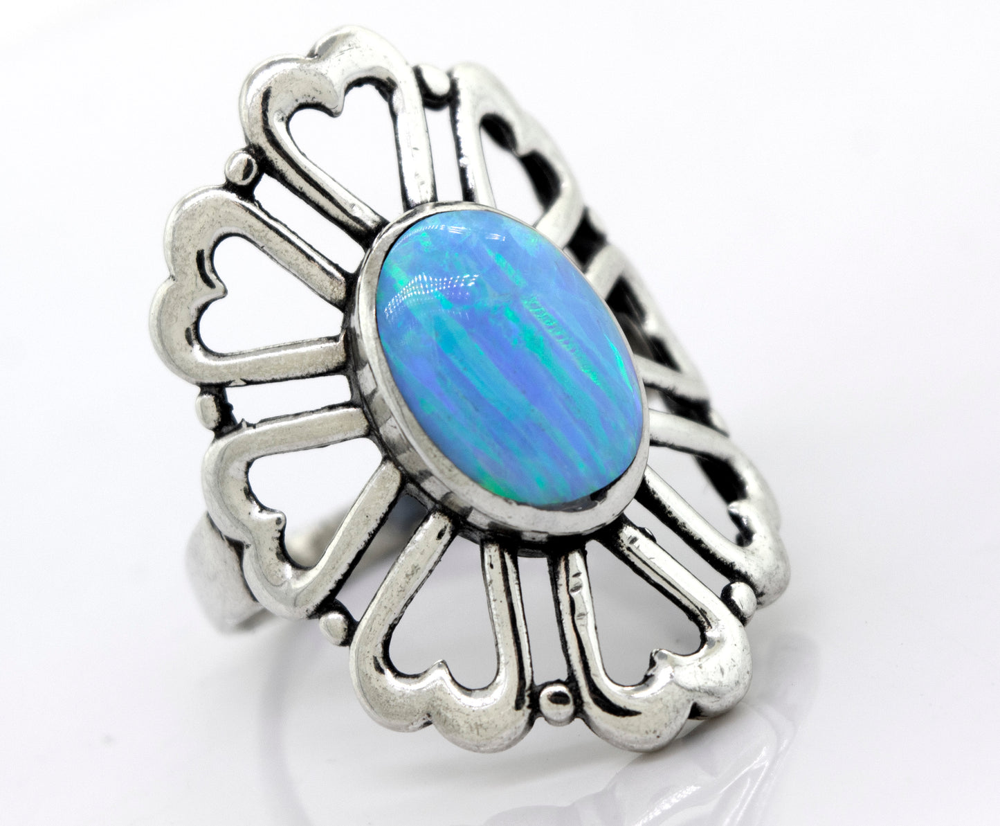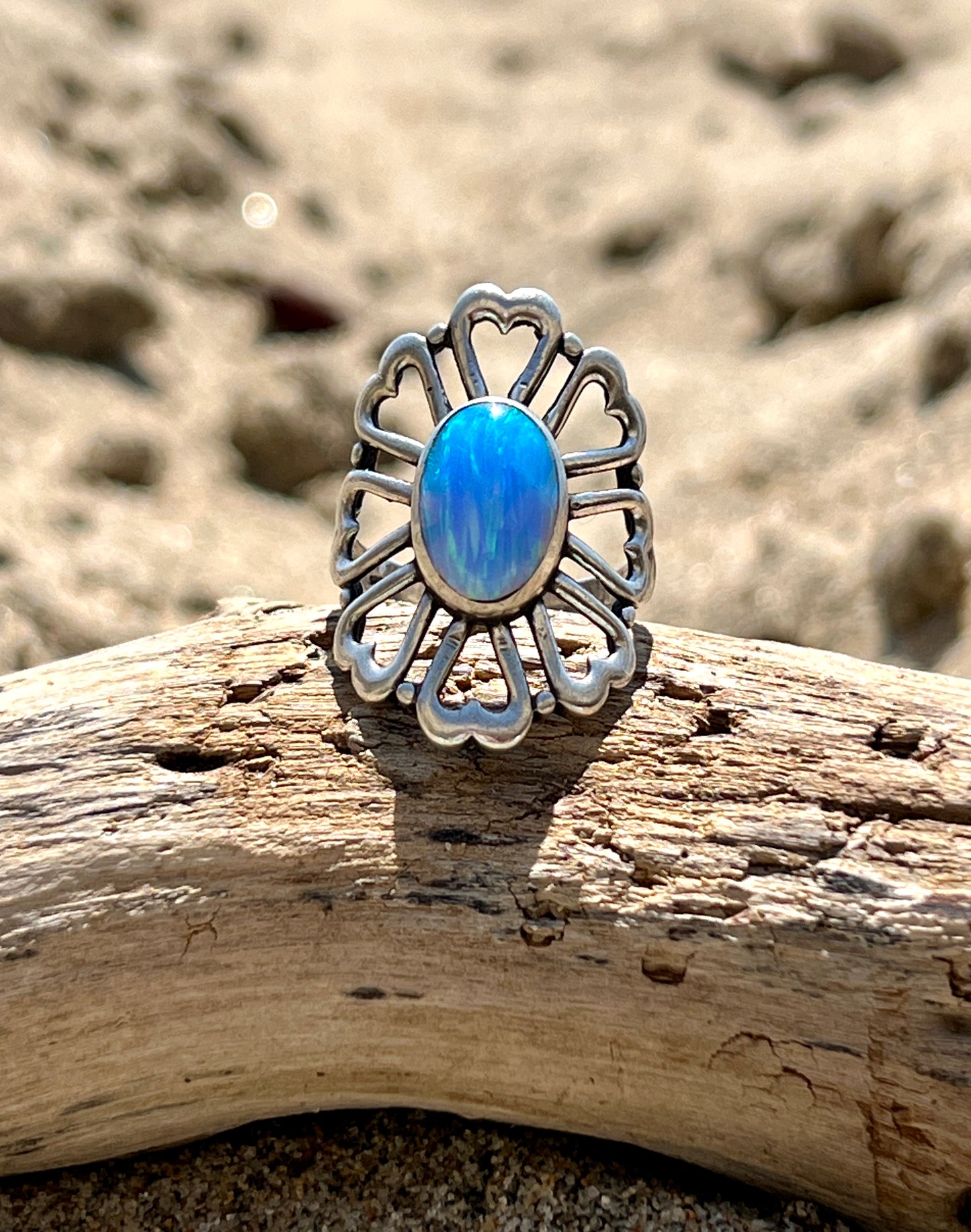 Beautiful blue, white, or green opal set in an attractive flower design.