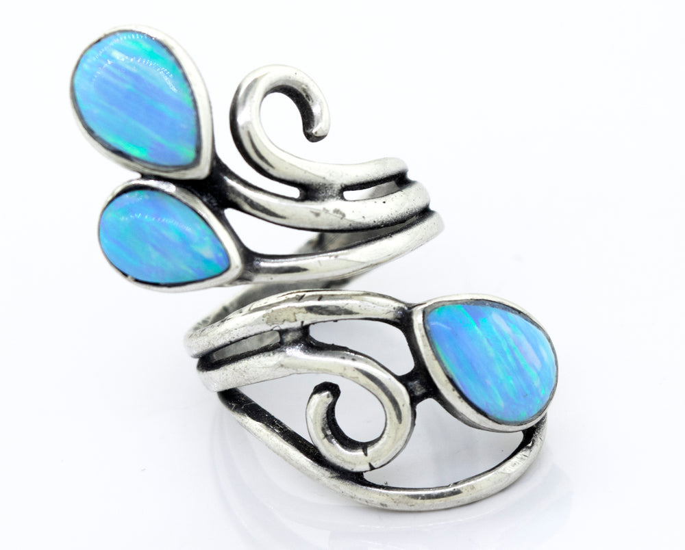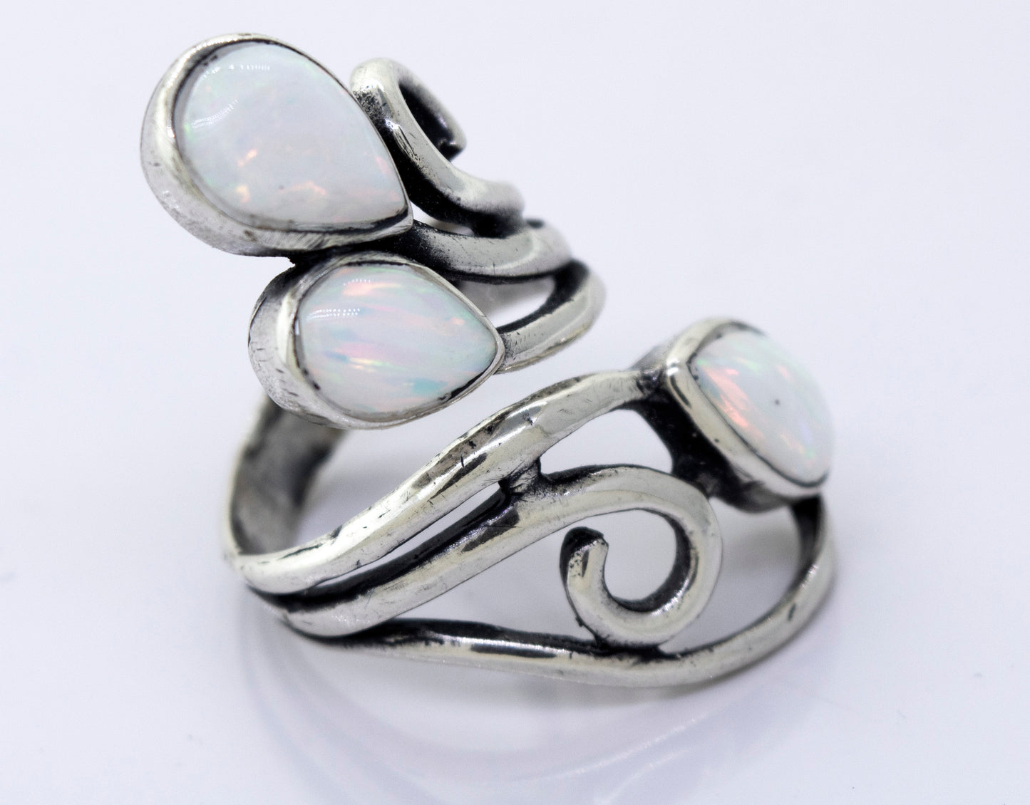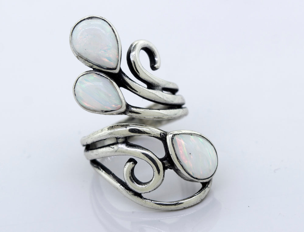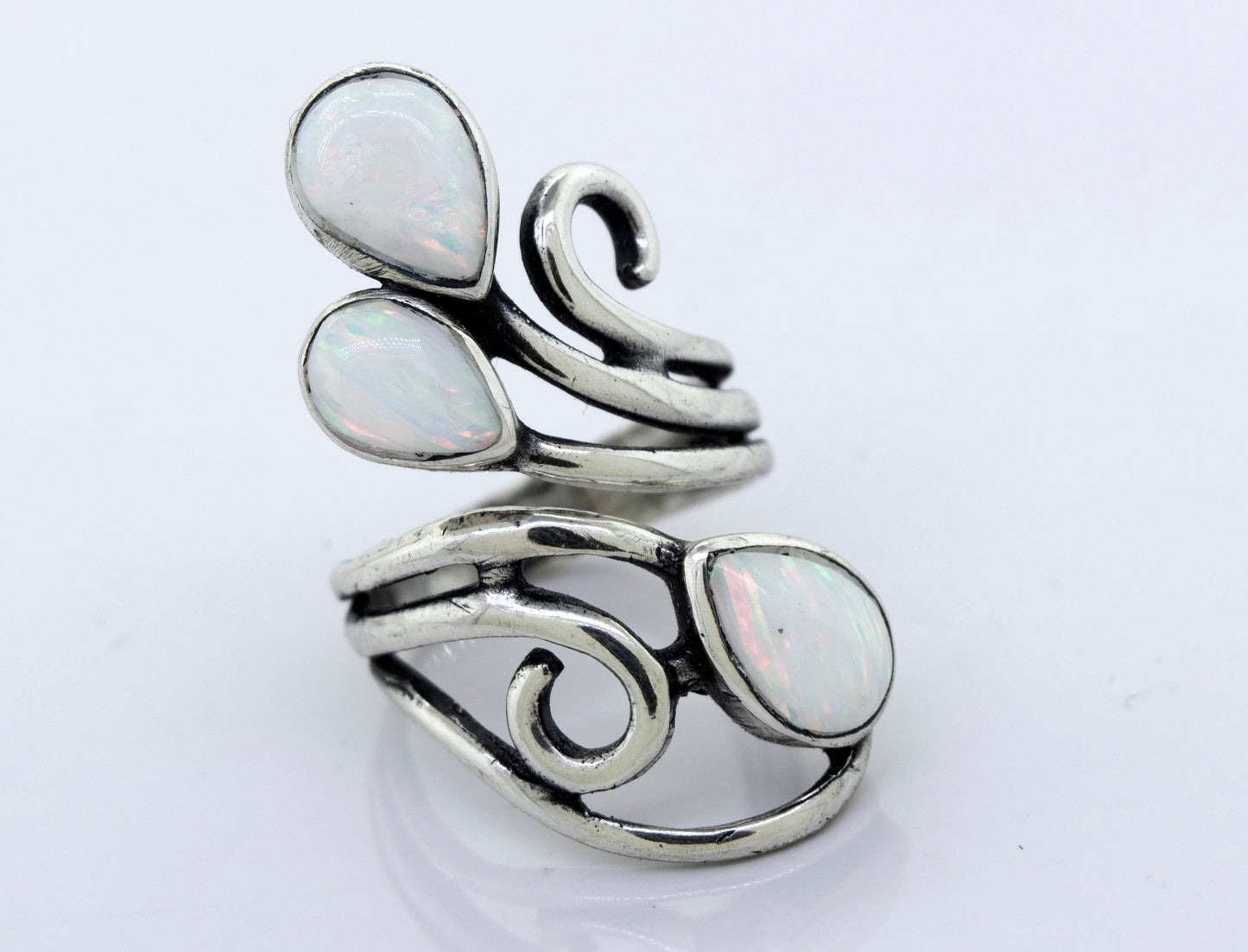 A stunning statement ring glistens with its opal stone's soft subtle glimmer. This ring embraces your finger in a captivating dance of grace and wonder. Choose from the soft glow of the white opal, the brilliant ocean blue, or the dreamy seafoam green. You will surely be amazed by its beauty, whichever color you choose.