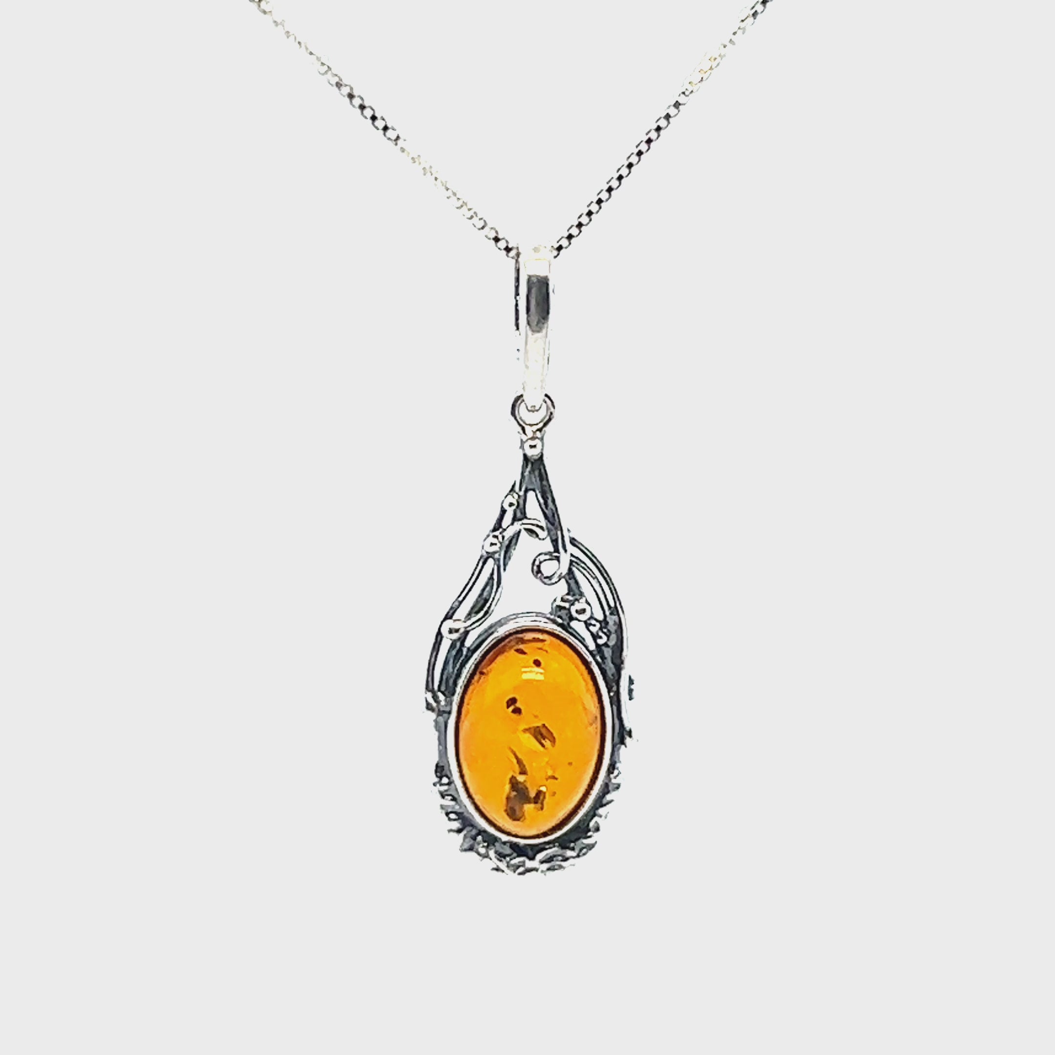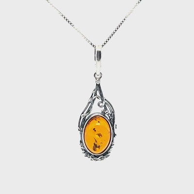 This beautiful Amber pendant is the pinnacle of dignified class. The vintage-styled intricate vines wrapping around the stone give this pendant a romantic, Victorian feel. Amber has been thought by many to balance decision-making and provide courage and fortune to the wearer. This pendant's dainty old-world design and glowing stone make for a memorable piece that can be worn daily.