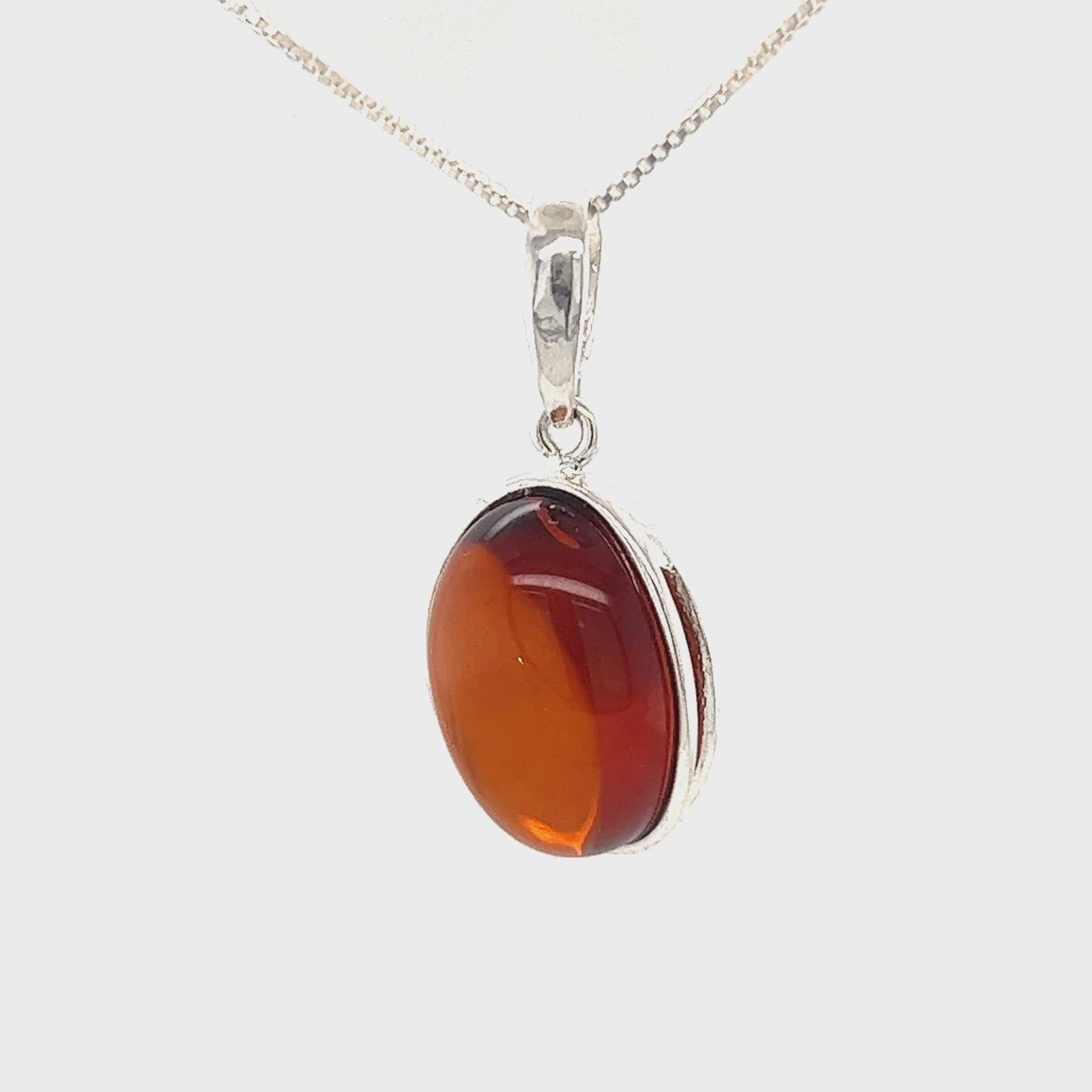 A simply charming Baltic amber pendant displays a warm buttery cognac coloring. The modest silver border gives focus to the rich honey drop stone, whose soft glows give the impression of amber newly released from ancient trees. Amber is a powerful healer and cleanser of the body. It has been revered for its powers to absorb negative energy, pain, and stress bringing one calmness, a sense of empowerment, self-confidence, and love.