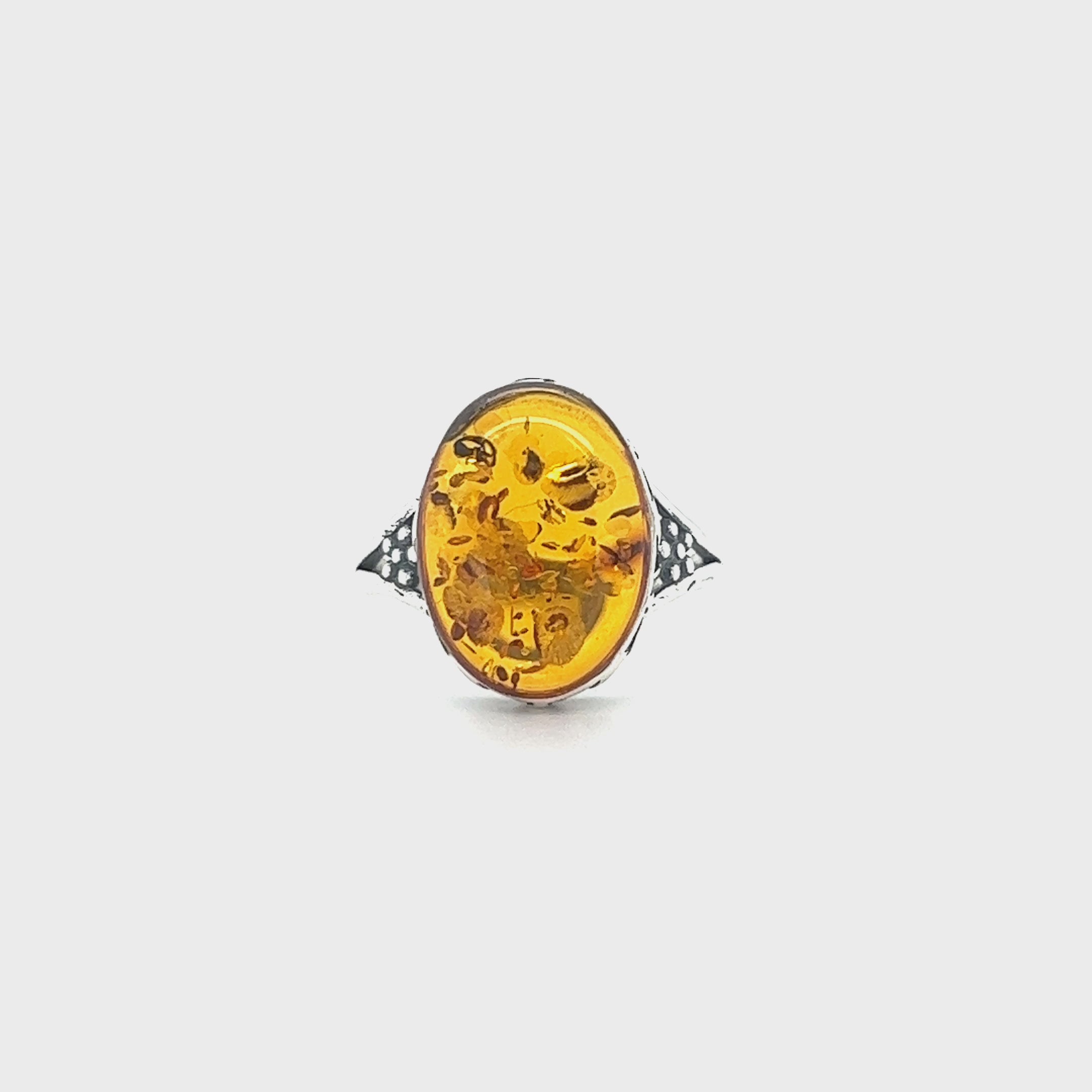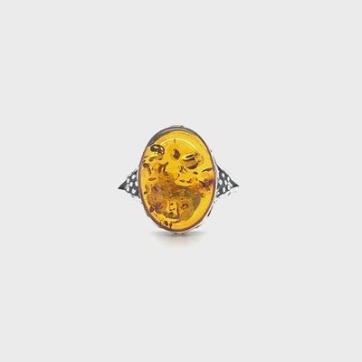 Embrace your inner strength with this captivating amber ring. The simple oxidized floral setting gives a rich Victorian feel to the gorgeous honey-colored amber glows, a perfect ring for any boho chic, everyday style. Amber is believed to be a powerful healer and cleanser of the body. Many revered it for its powers to absorb negative energy, pain, and stress, bringing one calmness, empowerment, self-confidence, and love. The earthy tones of amber and vintage design make this ring ideal for anyone looking for an everyday ring that can be dressed up or down. Pair it with the matching pendant for an outstanding set.