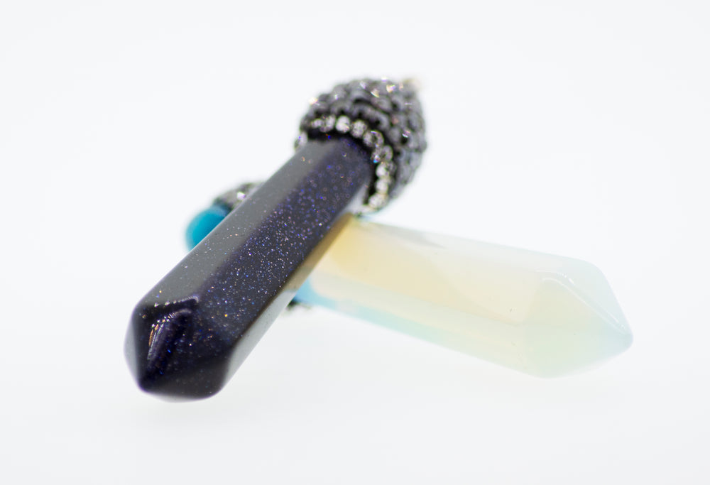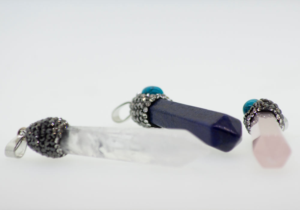 Obelisk Crystal Pendant set with tiny hematite beads and a small oval-shaped turquoise stone.