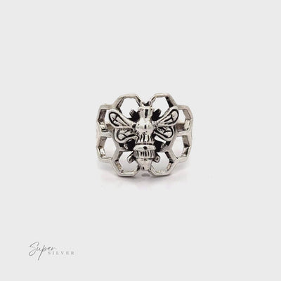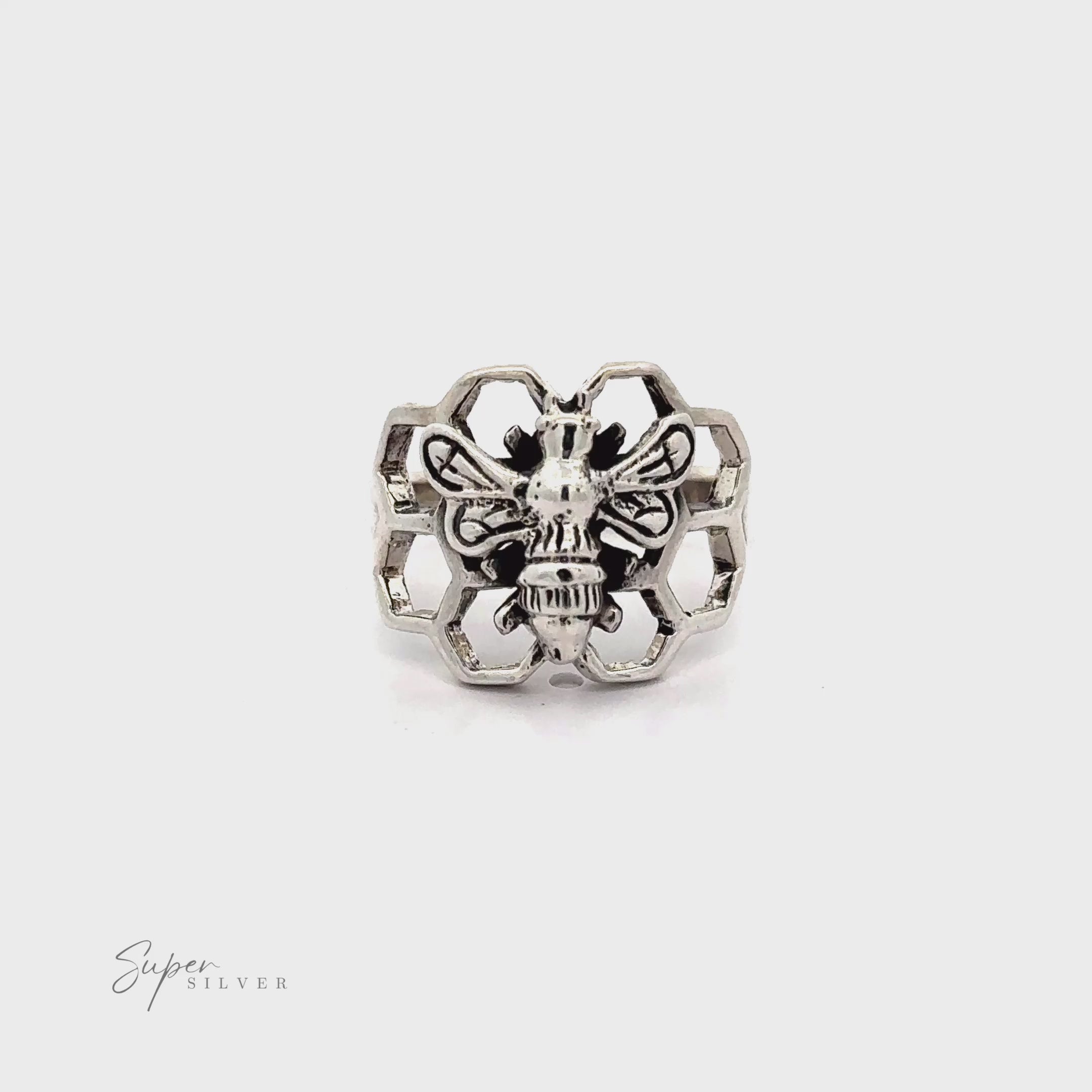 A wonderfully detailed honey bee design with a honeycomb background. This ring design has a thicker band, which is perfect for durability.
