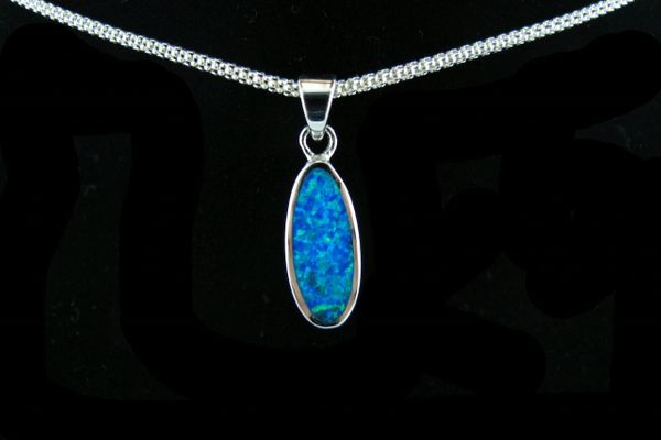 This captivating blue opal pendant sparkles in the sunlight. Set in a classic oval setting with a brilliant rhodium finish.