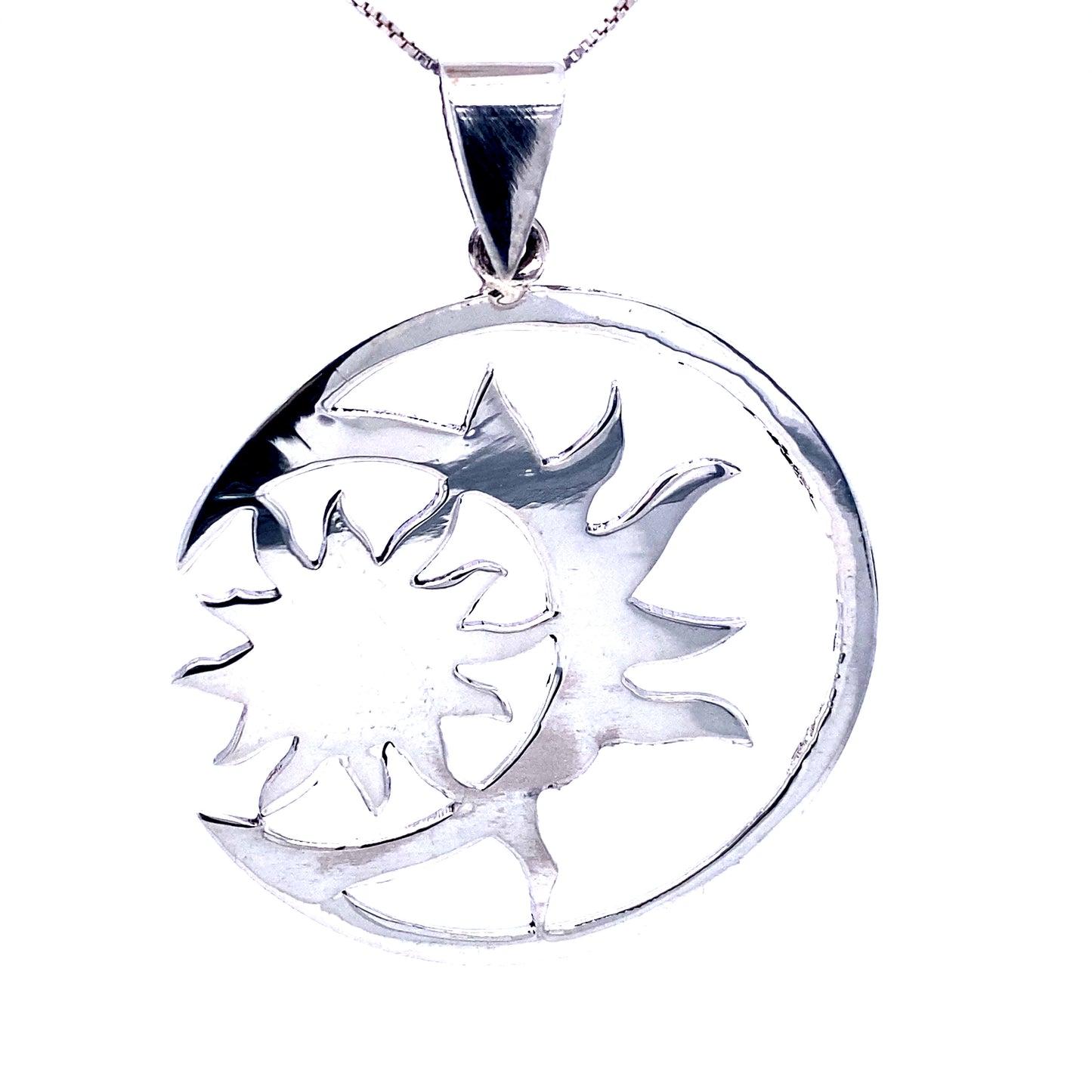 Manifest balance with this spectacular sun and moon pendant. The moon is well known for its relaxed, soothing properties, while the sun exudes power and confidence. When put together, they signify the ultimate power between masculine and feminine energies- divinity. The large size and sleek design make it the perfect statement piece. Whether you simply enjoy celestial bodies or crave ultimate balance, this pendant is ideal for all types.