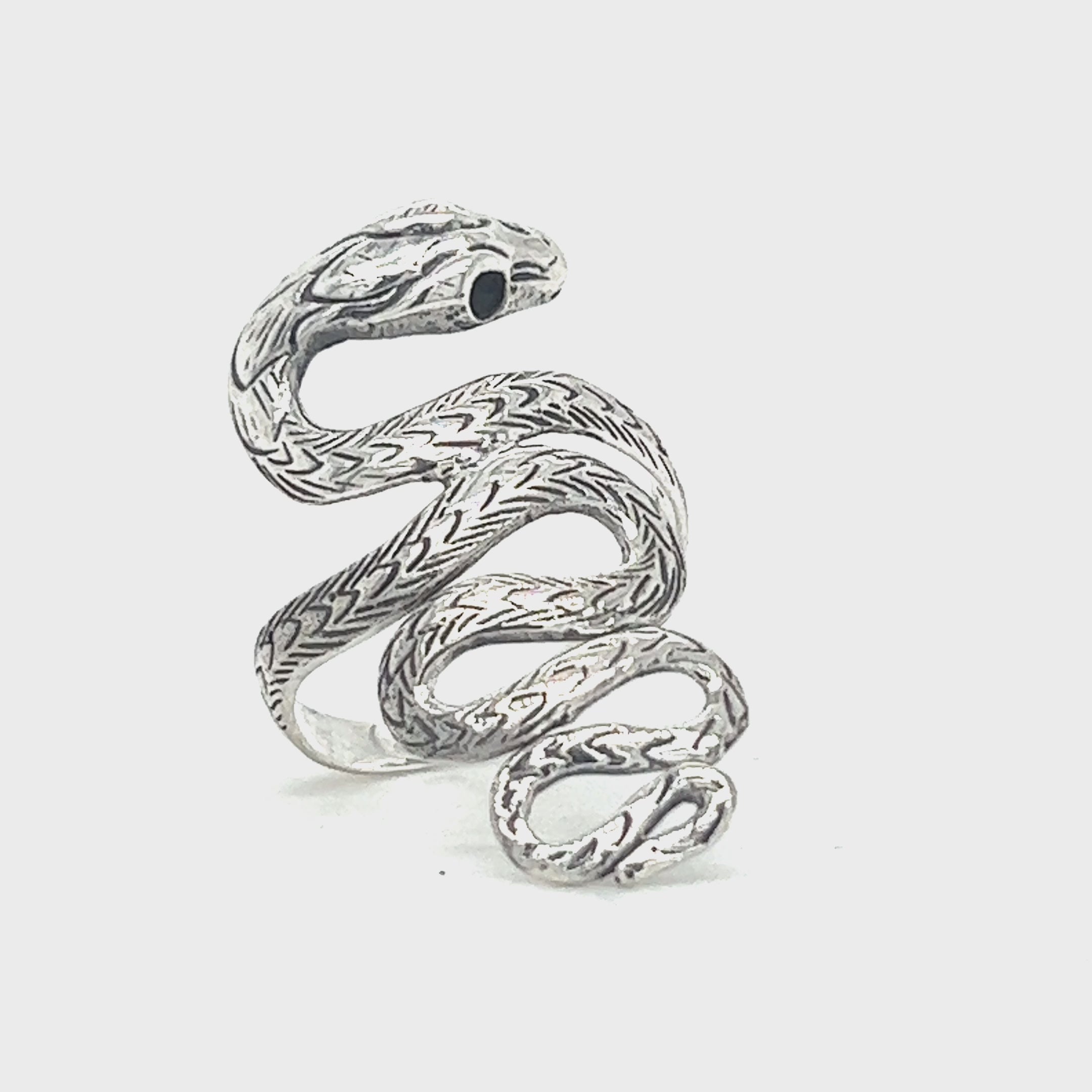 This tantalizing snake ring twists up your finger in a captivating pose. The enchanting serpent's oxidized and twisting textured scales make this timeless snake ring stand out like no other. Snakes are mysterious creatures that have inspired both fear and worship throughout time and are still a classic design today, symbolizing rebirth, fate, and the occult alike. So let these magical friends of witches slither into your heart and onto your finger!