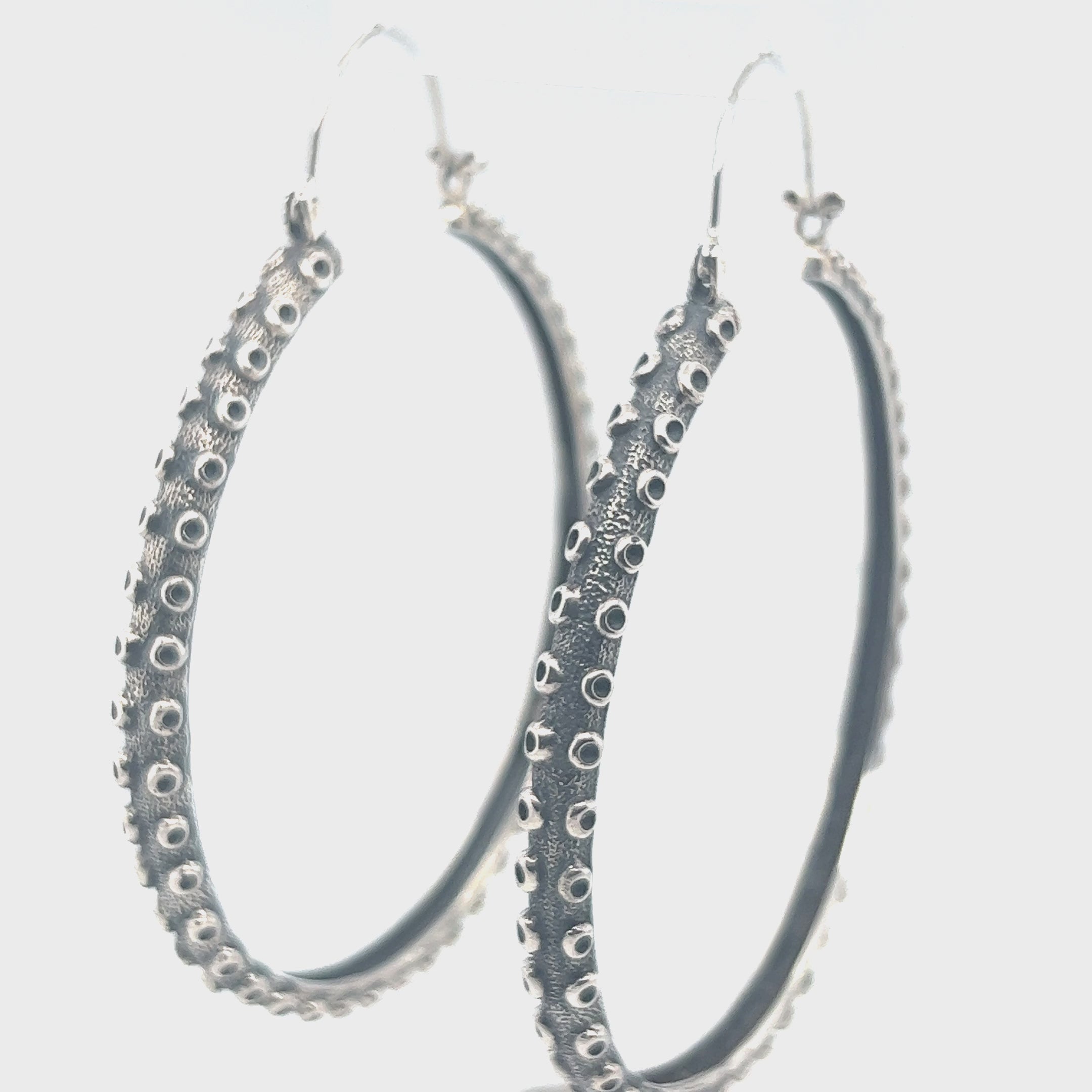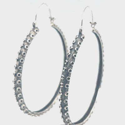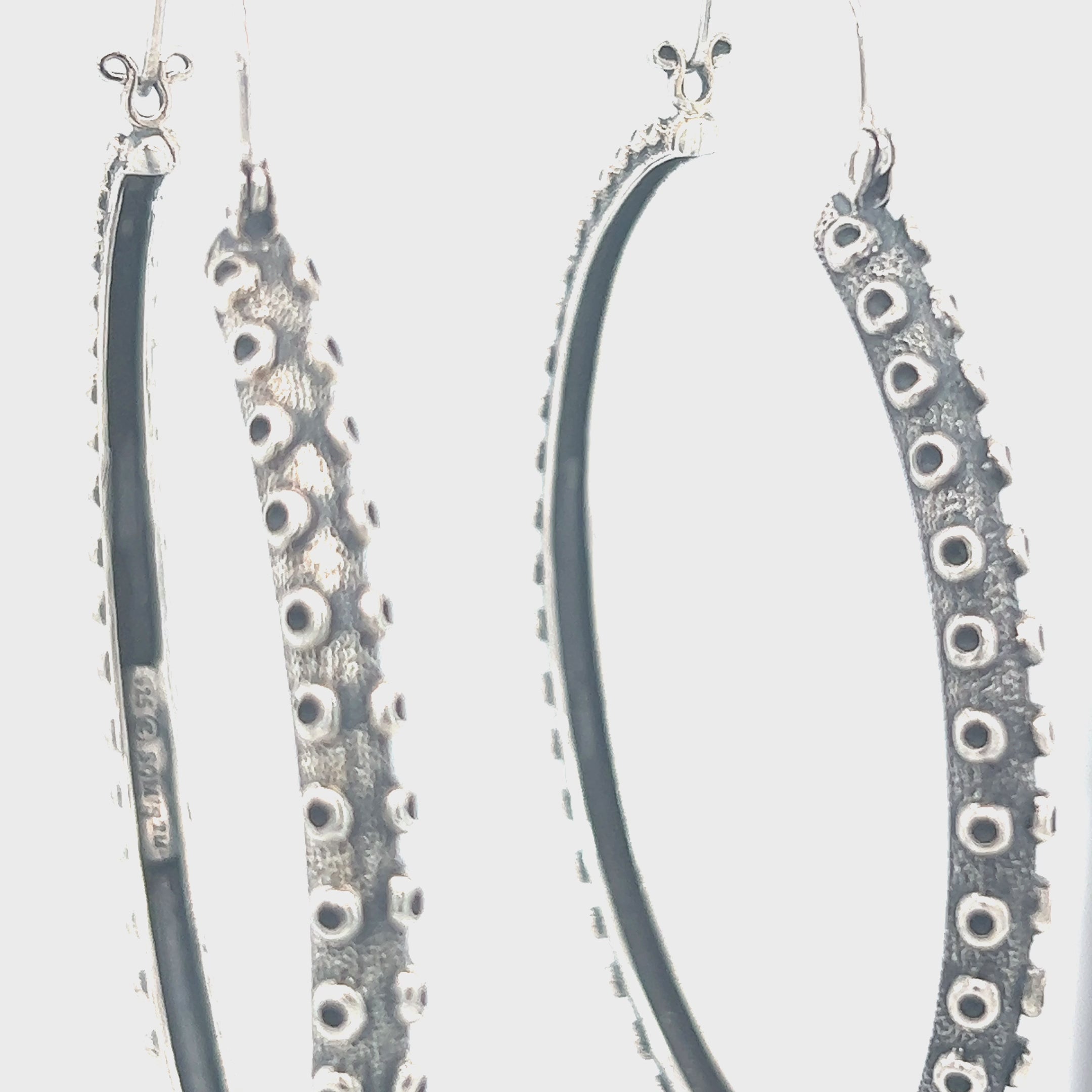 Channel the rhythmic ebb and flow of the tides with our Grand Tentacle Hoop Earrings, where size meets extraordinary design in a dramatic fashion. These oversized hoops are a testament to the mysteries of the deep sea, featuring a dark tentacle motif that whispers of the ocean's enigmatic charm. Their sheer size makes them impossible to ignore, allowing you to command attention with every turn of your head. Slip them on and revel in the uniqueness of these colossal hoops. Meticulously designed by one of our treasured artisan collections, renowned for their mesmerizing and commanding jewelry, these earrings are the perfect choice for those enchanted by the sea's majesty or those seeking to express their unique, captivating style.
