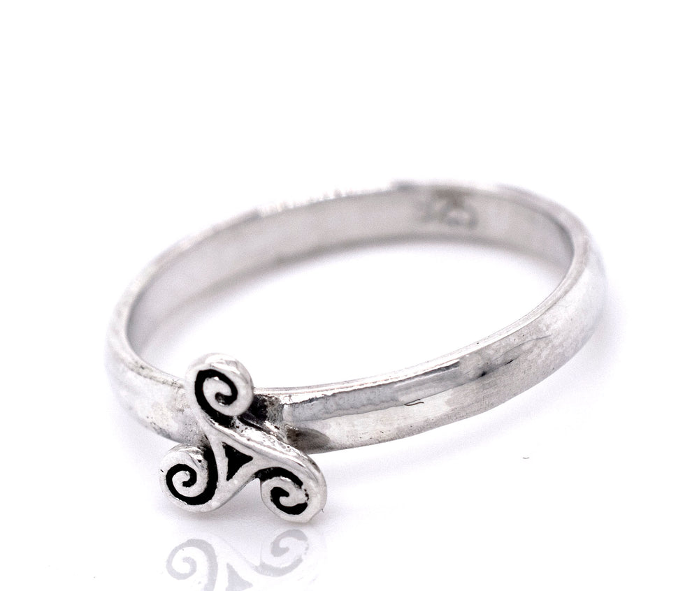 An intricately designed Dainty Triskelion Ring made of sterling silver.