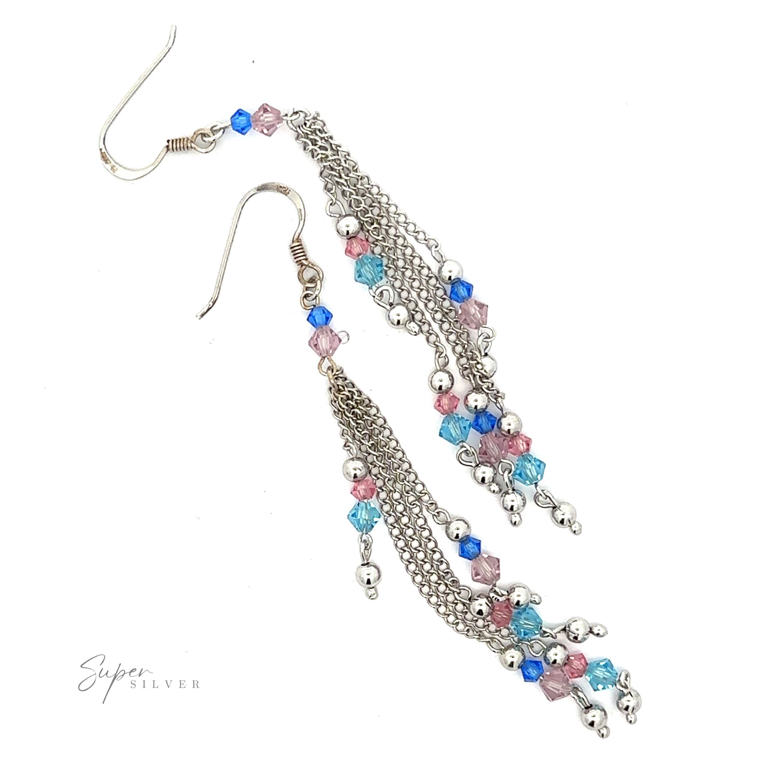 This rhodium-plated sterling silver chain with blue and green bead accents is a simple and elegant earring, perfect for any outfit. Rhodium Plating will keep it as shiny as the day you bought it without any polishing required!