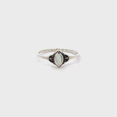 A delicate ring with various inlaid stones in a beautiful marquise shape. The stone is accompanied by simple detailing on each side. A perfect addition to your style for a simple touch of color.