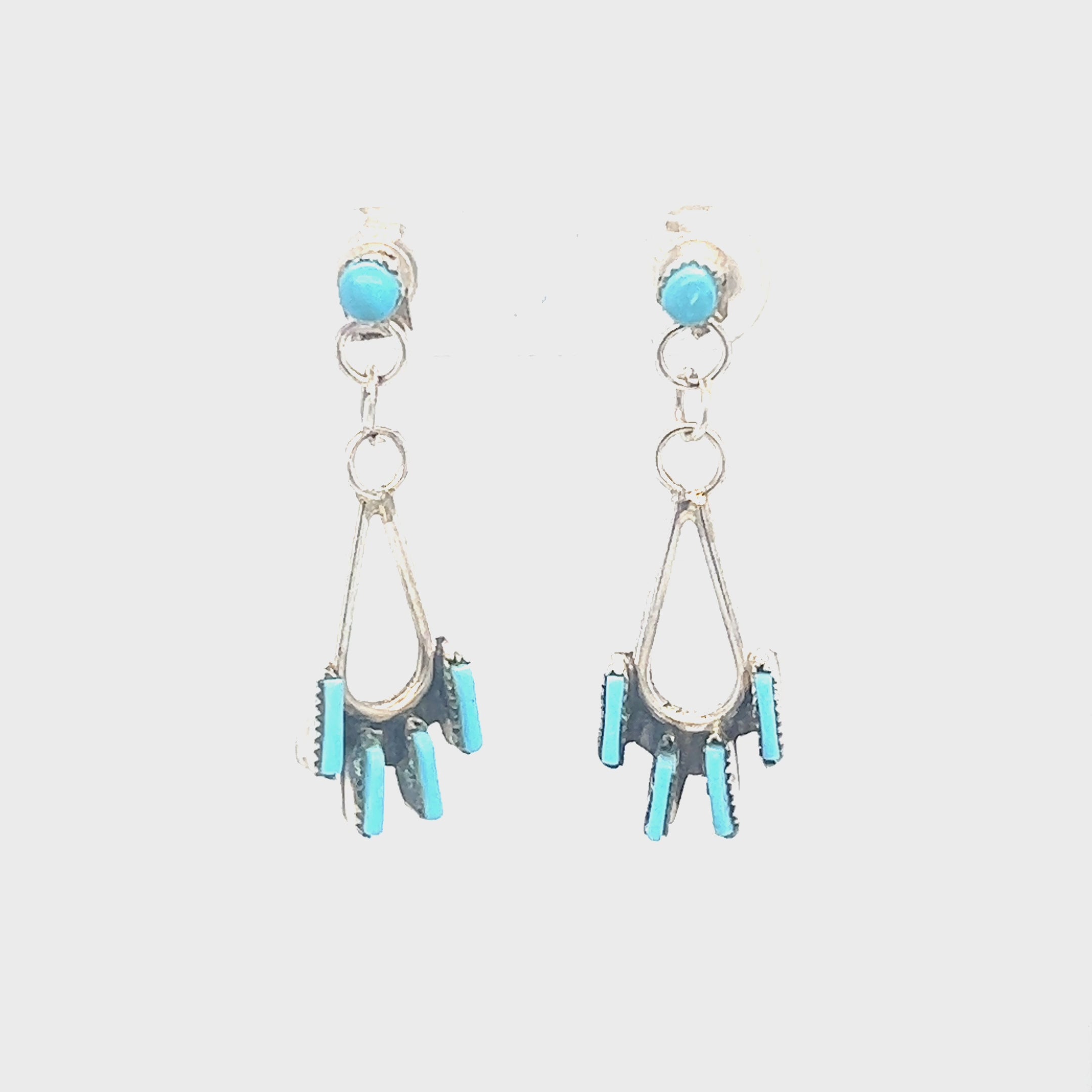 Add a touch of timeless elegance to your wardrobe with these delicate Handmade Zuni earrings. The brilliant blue turquoise shines with southwest charm in a petite, eye-catching package. The intricate needlepoint work in these stunning beauties is among the most labor-intensive designs. Truly works of art. Turquoise, a vital stone in Native American heritage, it is believed to calm and center the wearer, strengthening their energy and enriching their spiritual connections. So adorn yourself with the ancient beauty of the southwest with these delicate Zuni earrings.