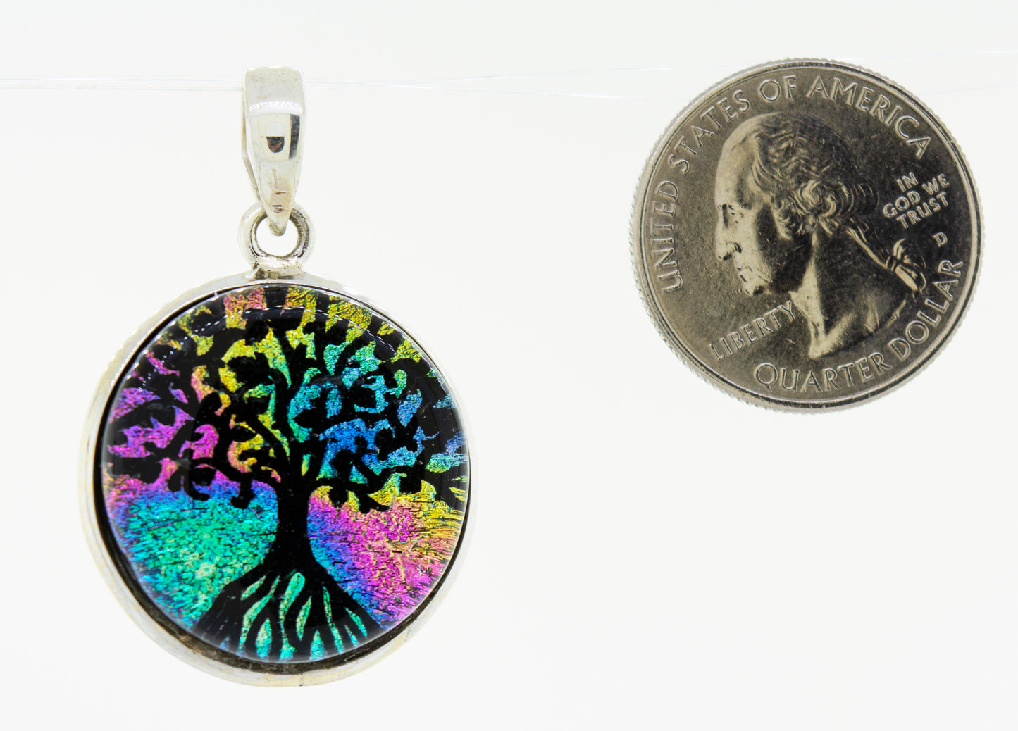 Beautiful Dichroic Glass pendant with Tree of Life in the center.