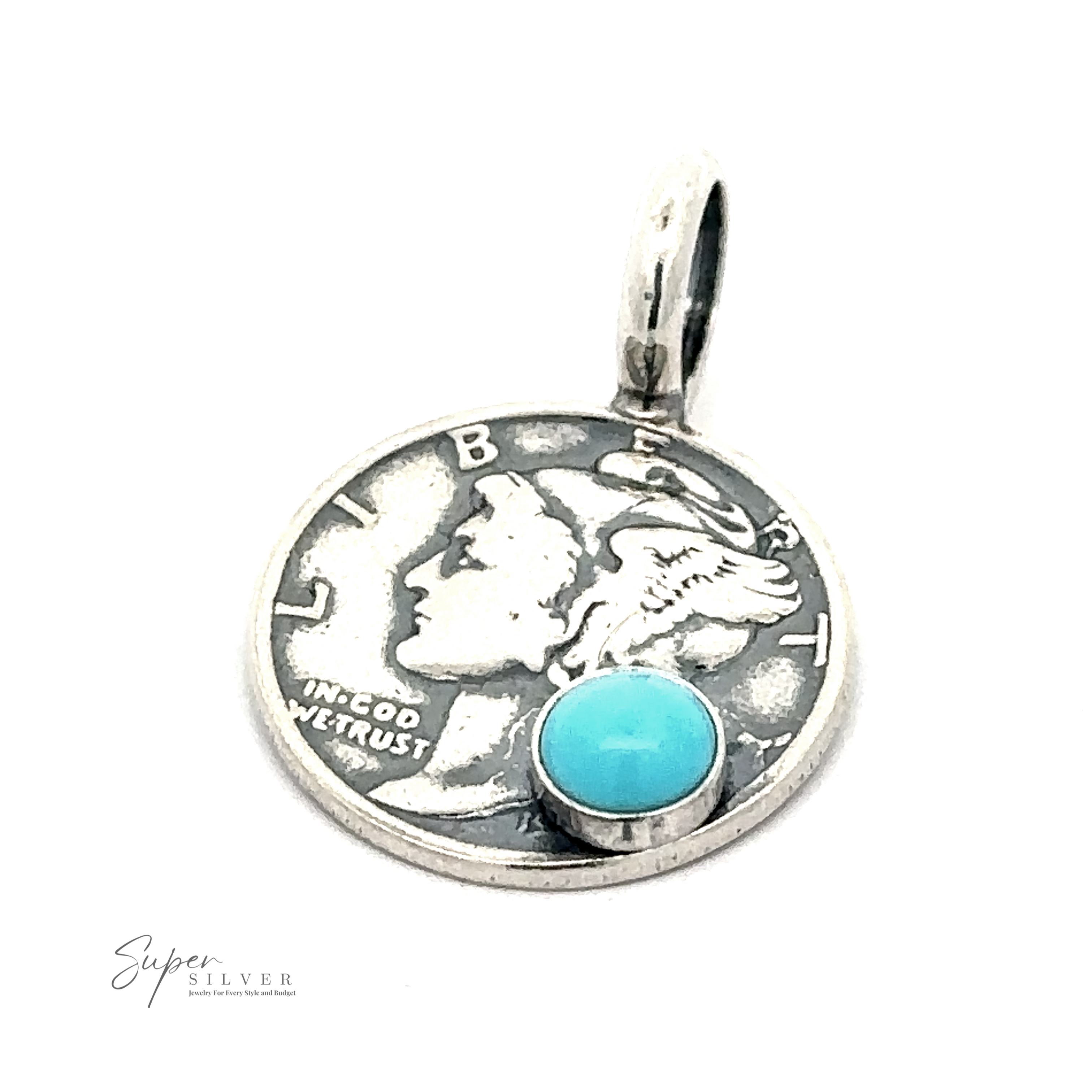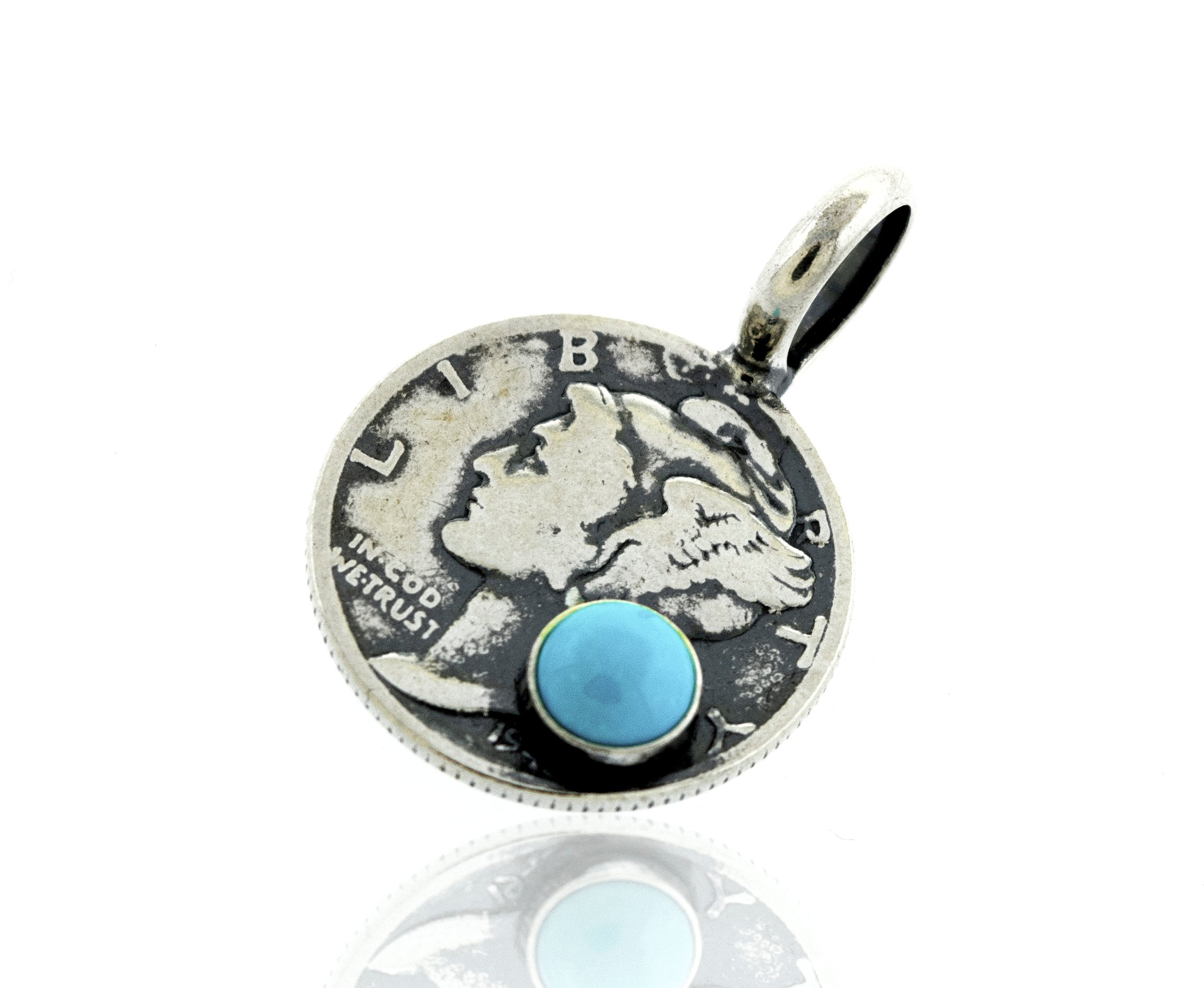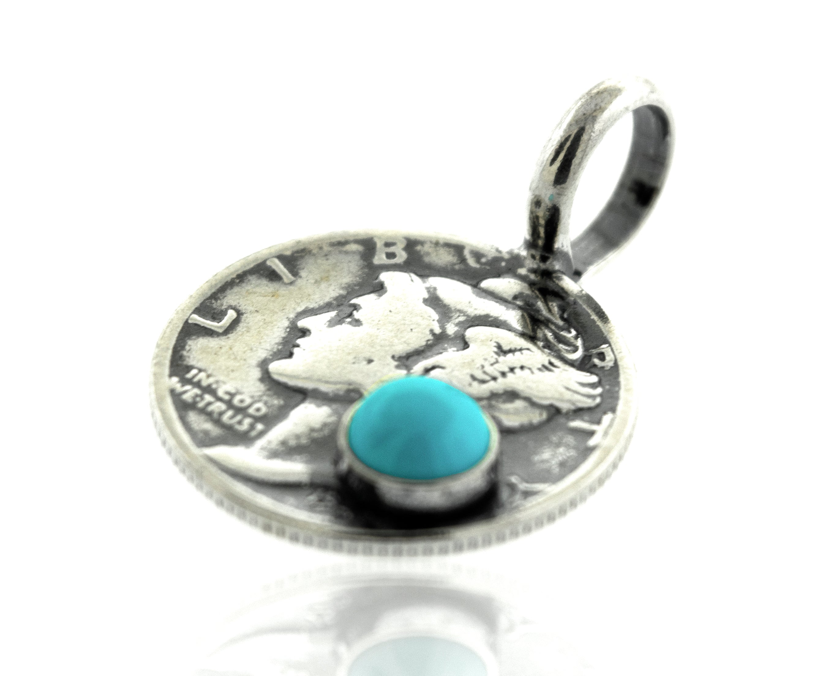 Handmade dime pendant with a round turquoise stone set in the bottom right quadrant.