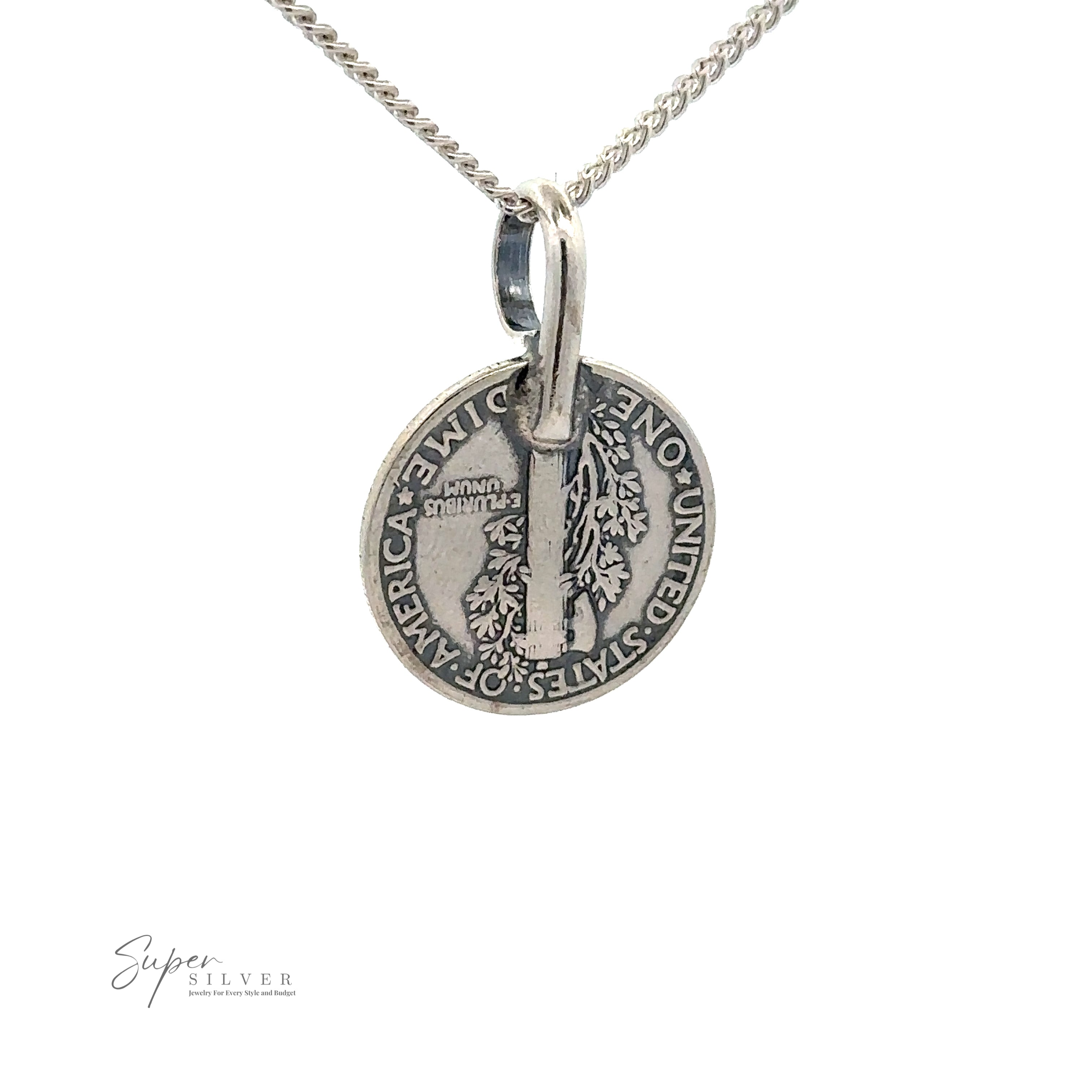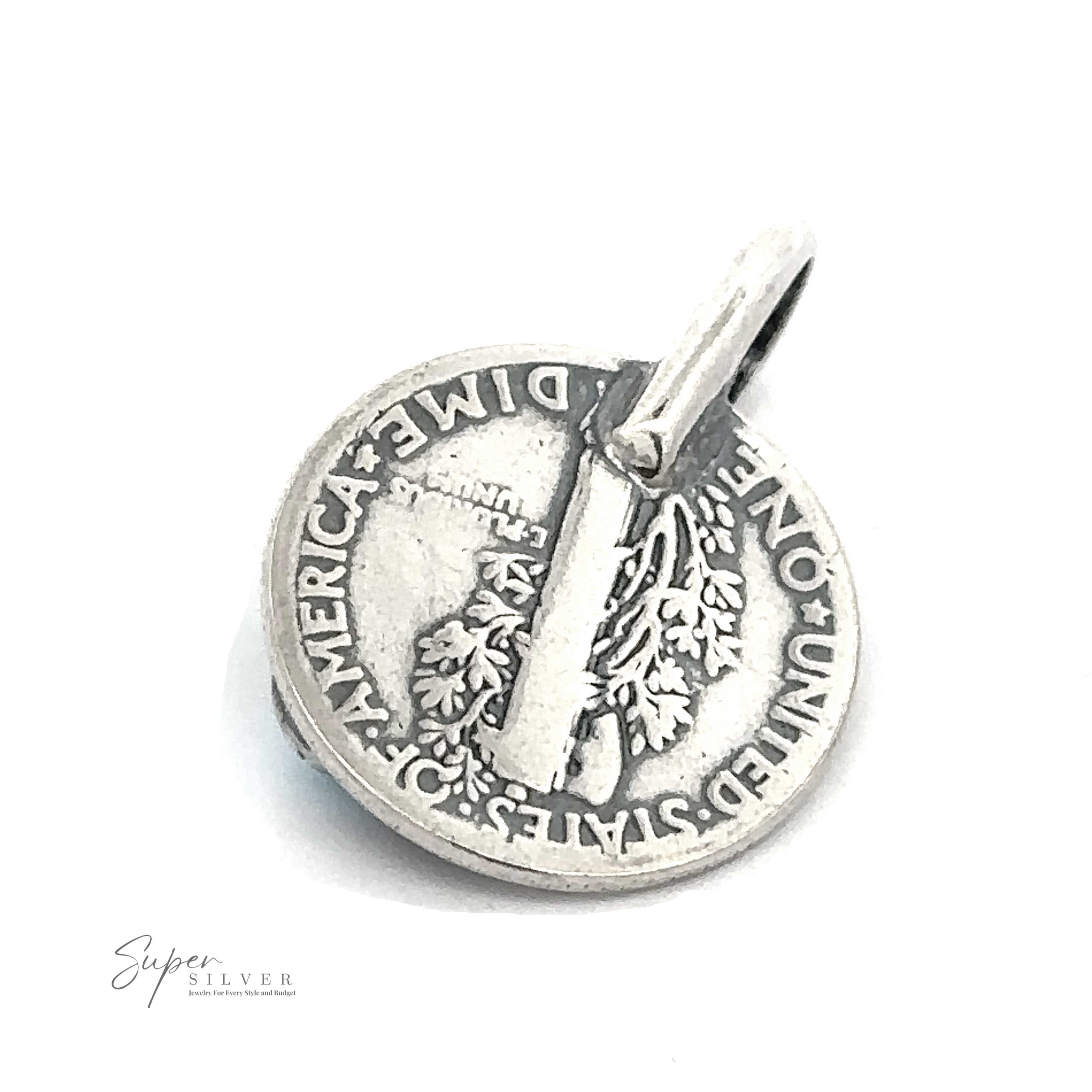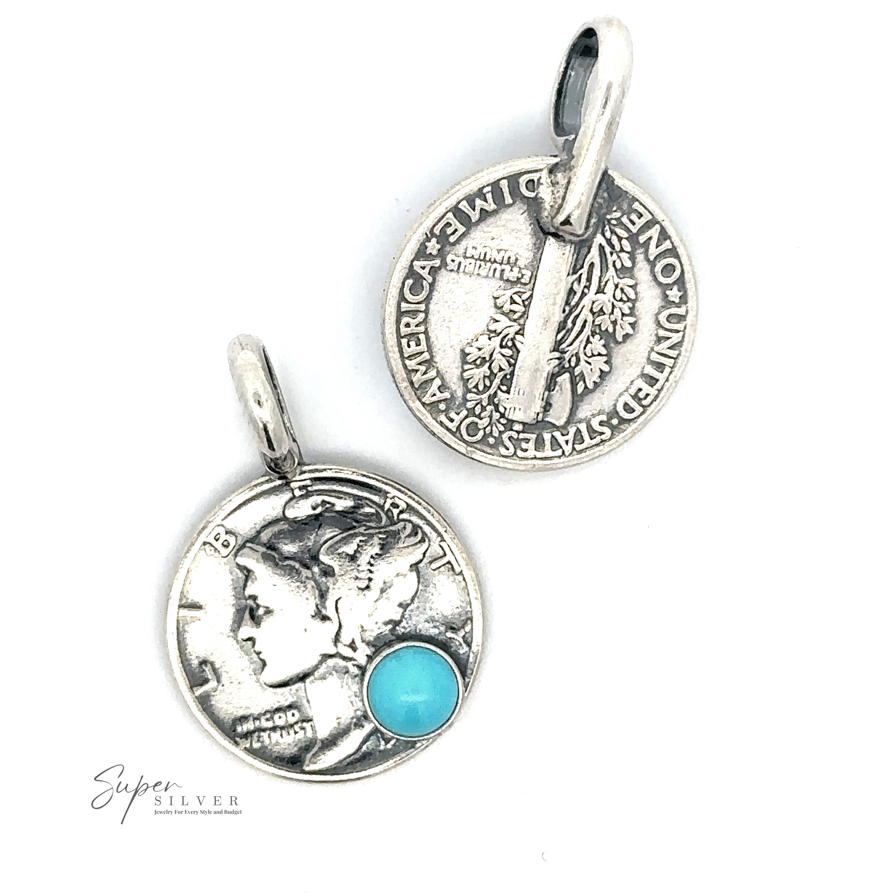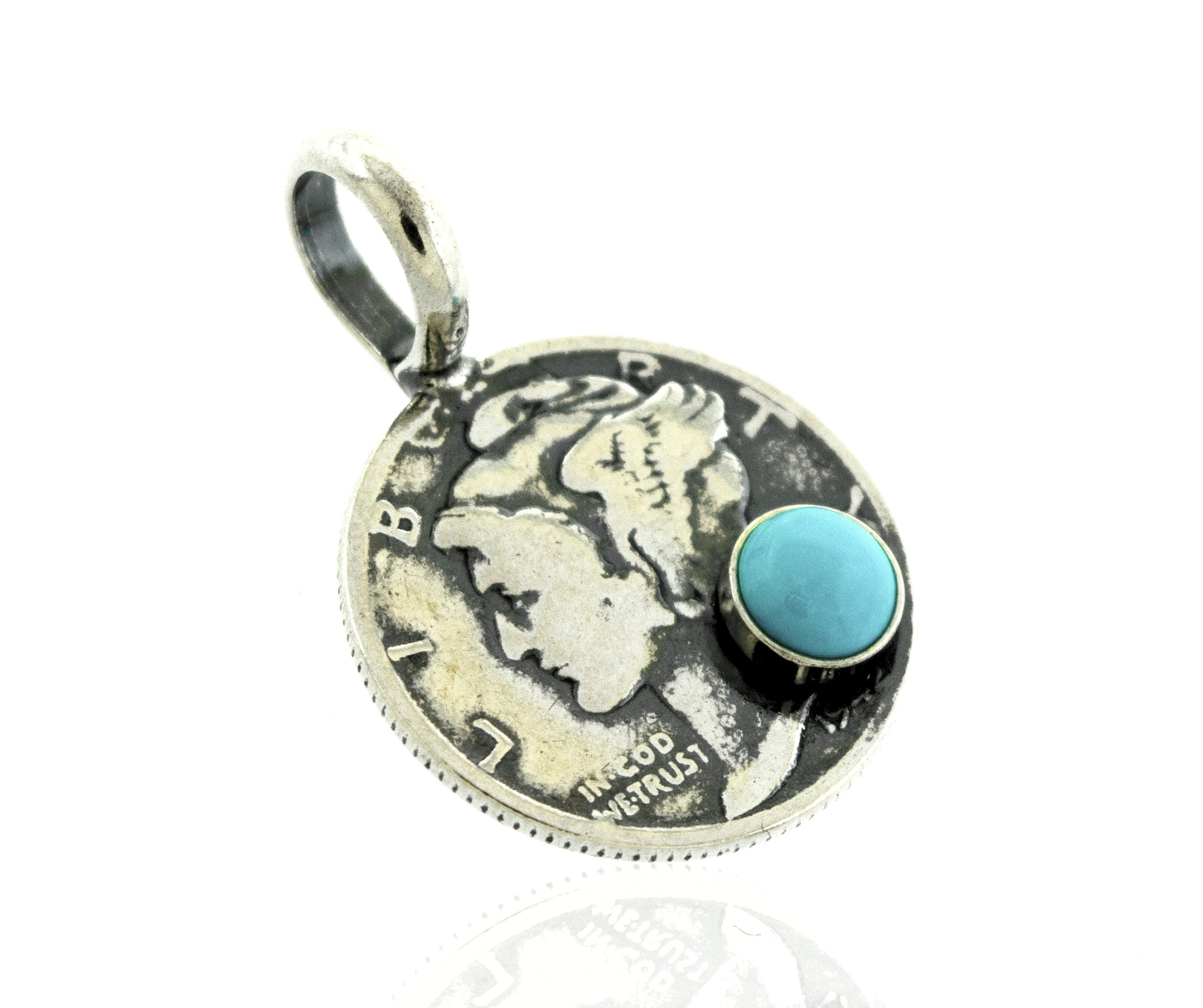 Handmade dime pendant with a round turquoise stone set in the bottom right quadrant.