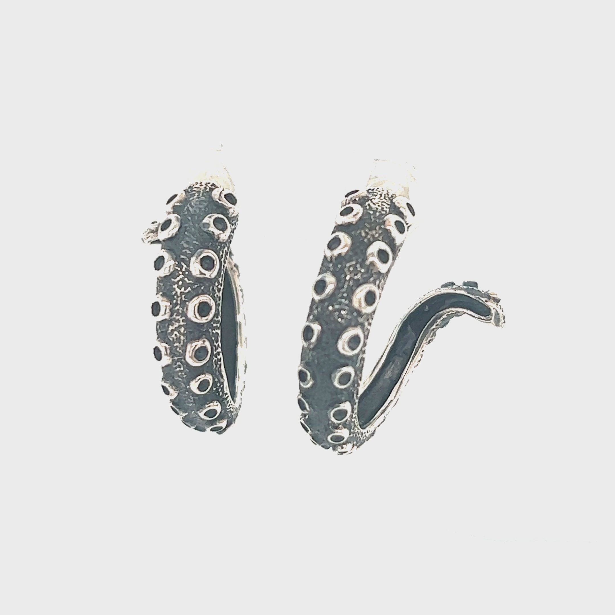 Channel the whispered secrets of the coral reefs with our Tentacle Hoop Earrings – an exquisite blend of oceanic charm and unique design. These extraordinary hoops feature a post-closure, with the tentacle gracefully curling out in a mesmerizing hoop formation reminiscent of the ocean's mysterious depths. Their captivating allure lies in their dark, oxidized finish, akin to the secrets of the deep sea. Wear them to infuse your style with a sense of adventure and marvel at the extraordinary beauty of the oceanic world. Dive into the allure of our Tentacle Hoop Earrings, where the elegance of the abyss meets your unique style, allowing your personality to spiral into the depths of fascination. Handcrafted by one of our treasured artisan collections, a mesmerizing and commanding jewelry line that consistently exceeds expectations, these earrings are a perfect choice for those enchanted by the ocean or those with a mysterious, adventurous spirit.