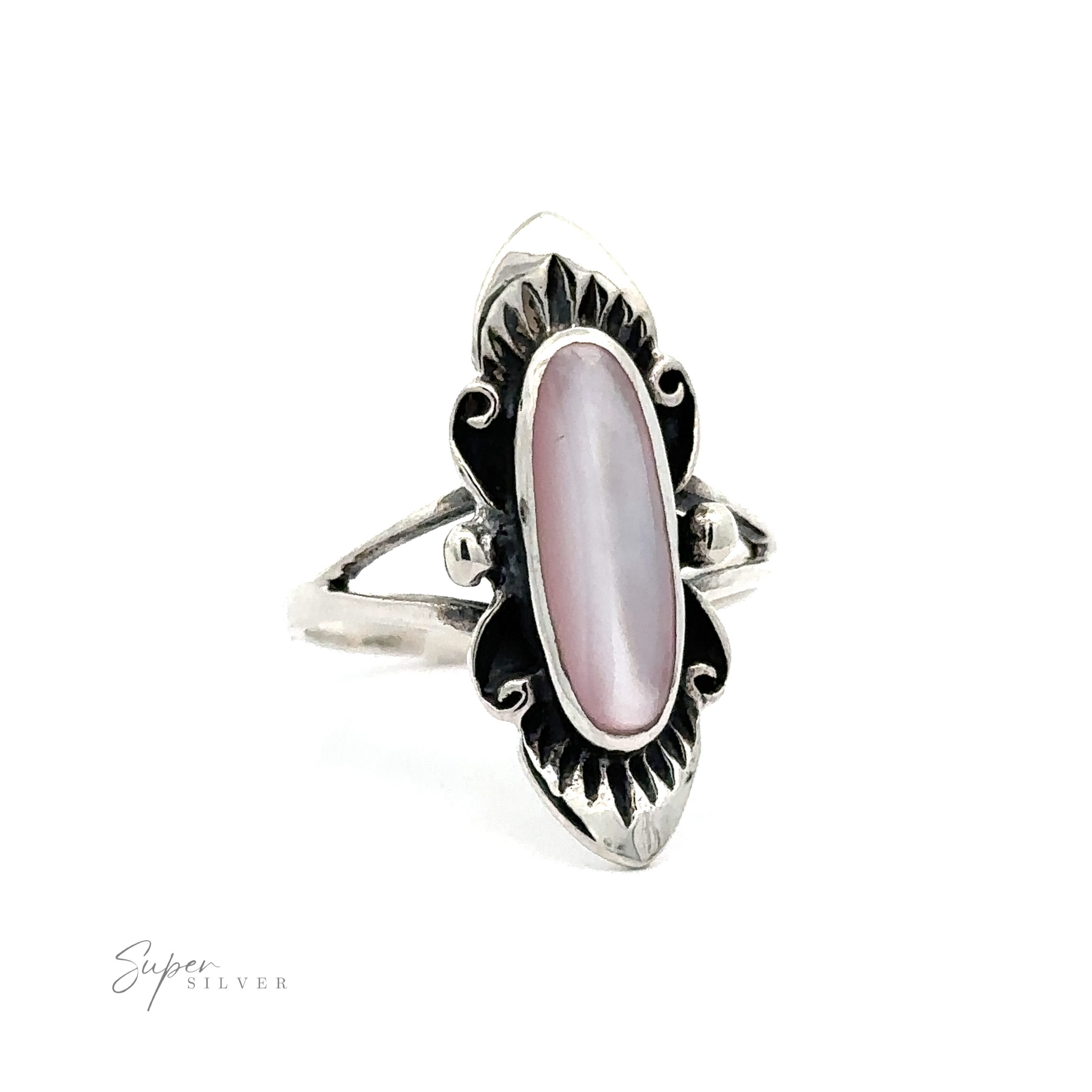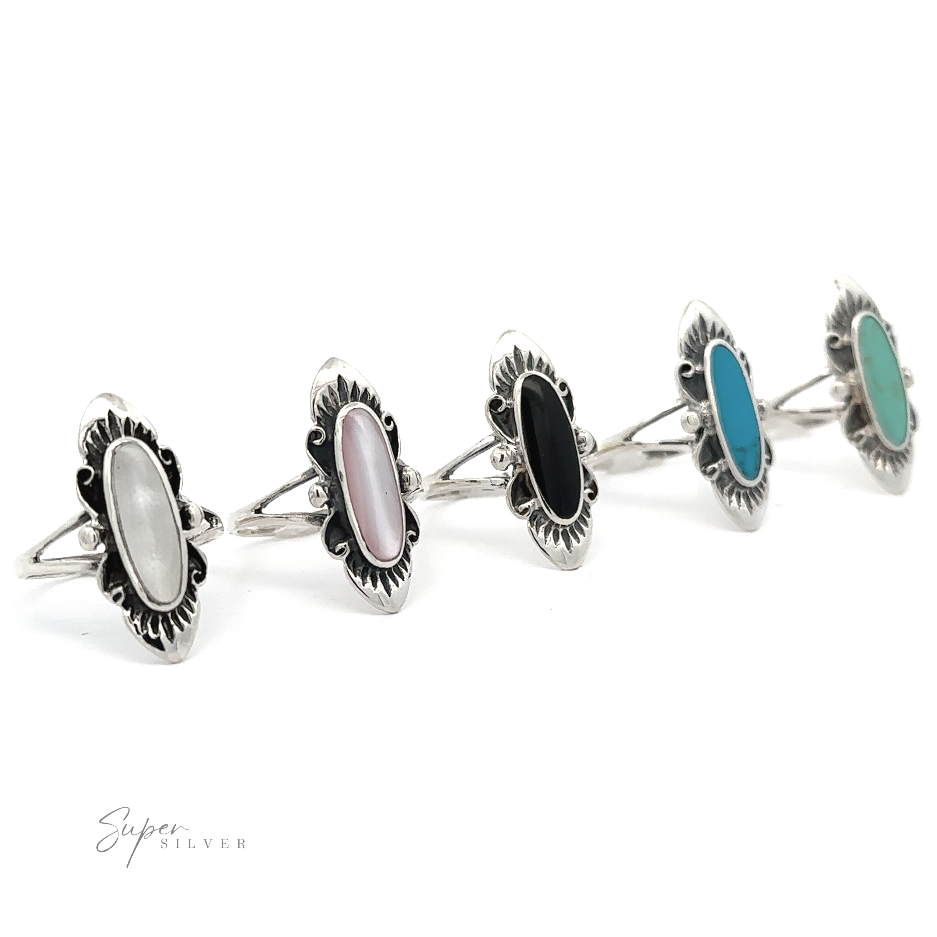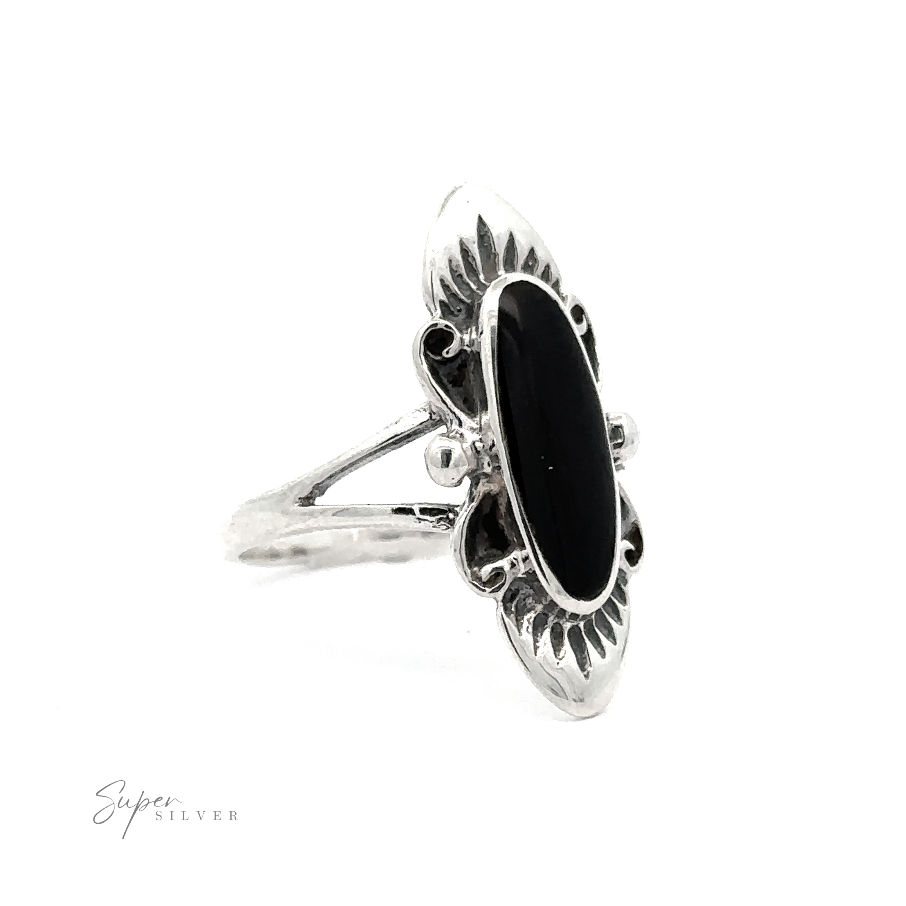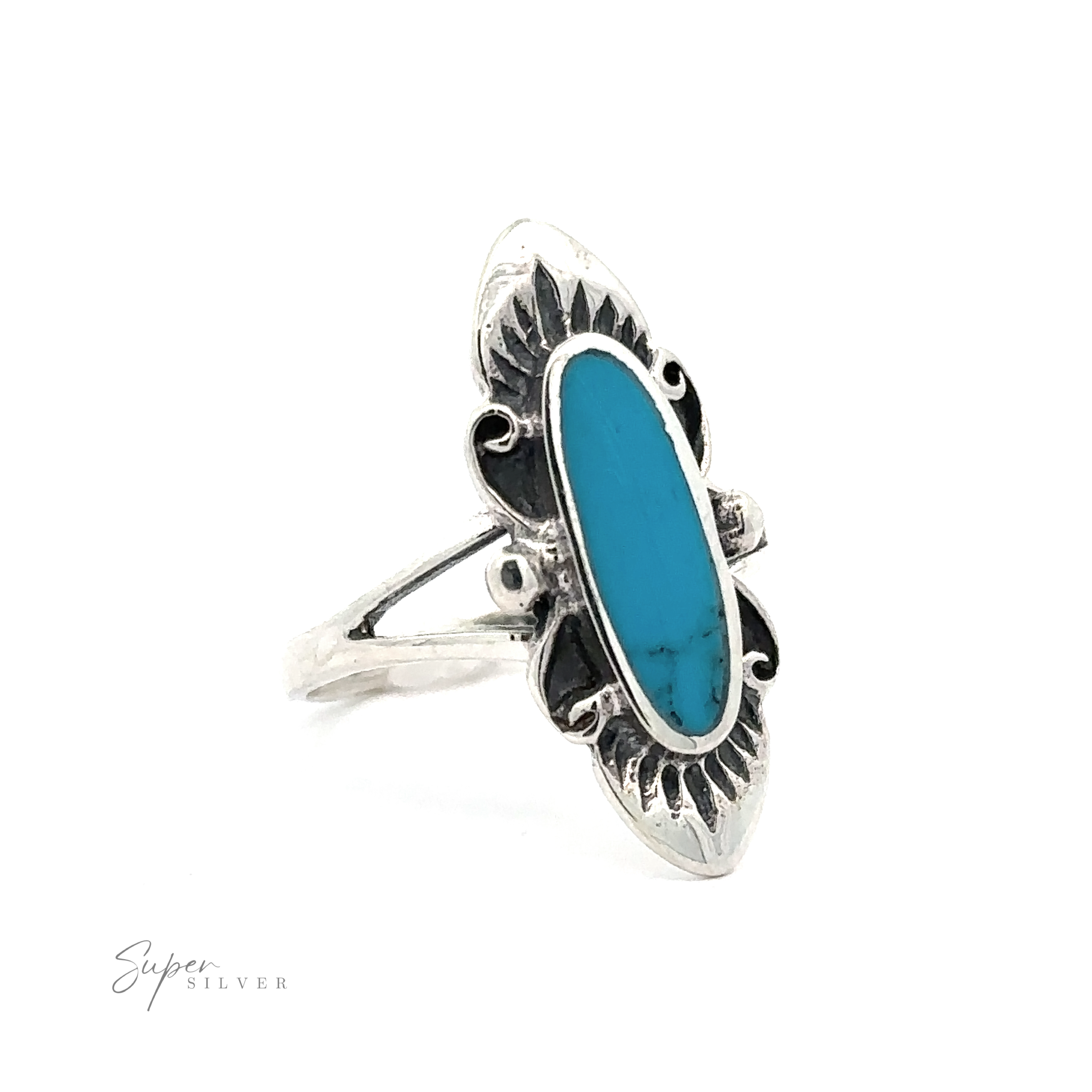 This stylish elongated oval turquoise ring has an antique look, with silver points on either end, giving it a slight shield look. This ring is very fashionable and an excellent piece for every day.