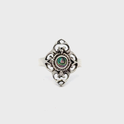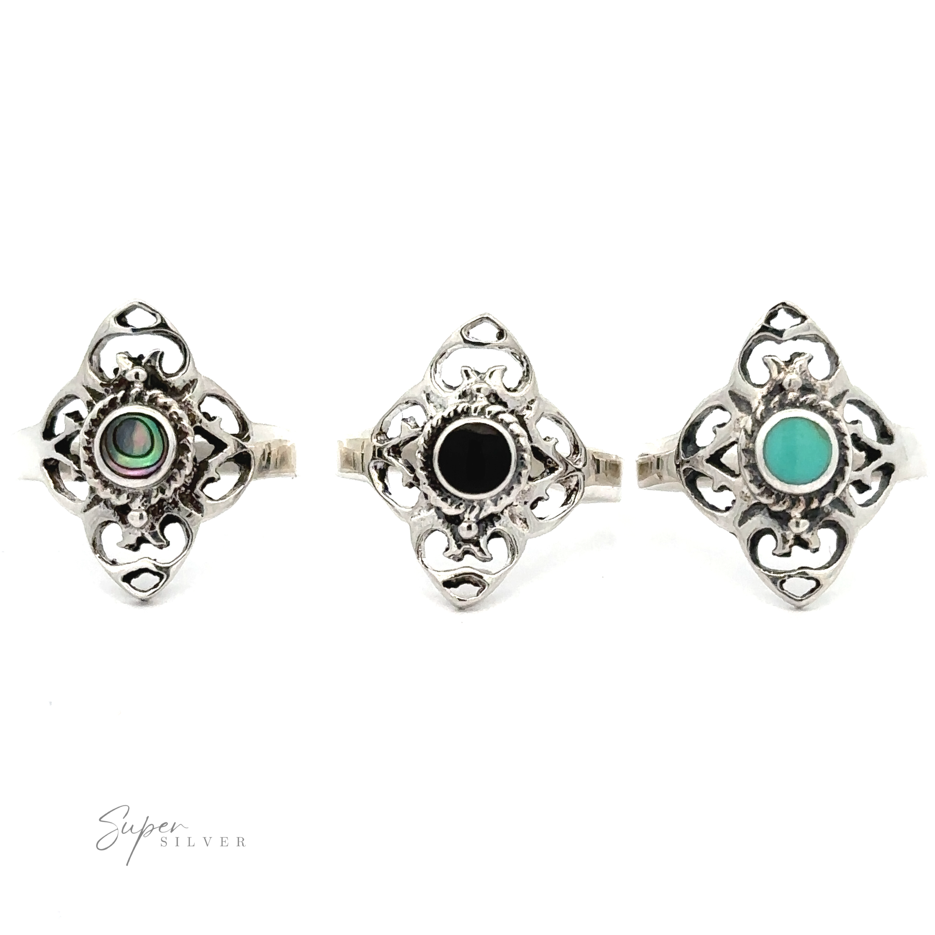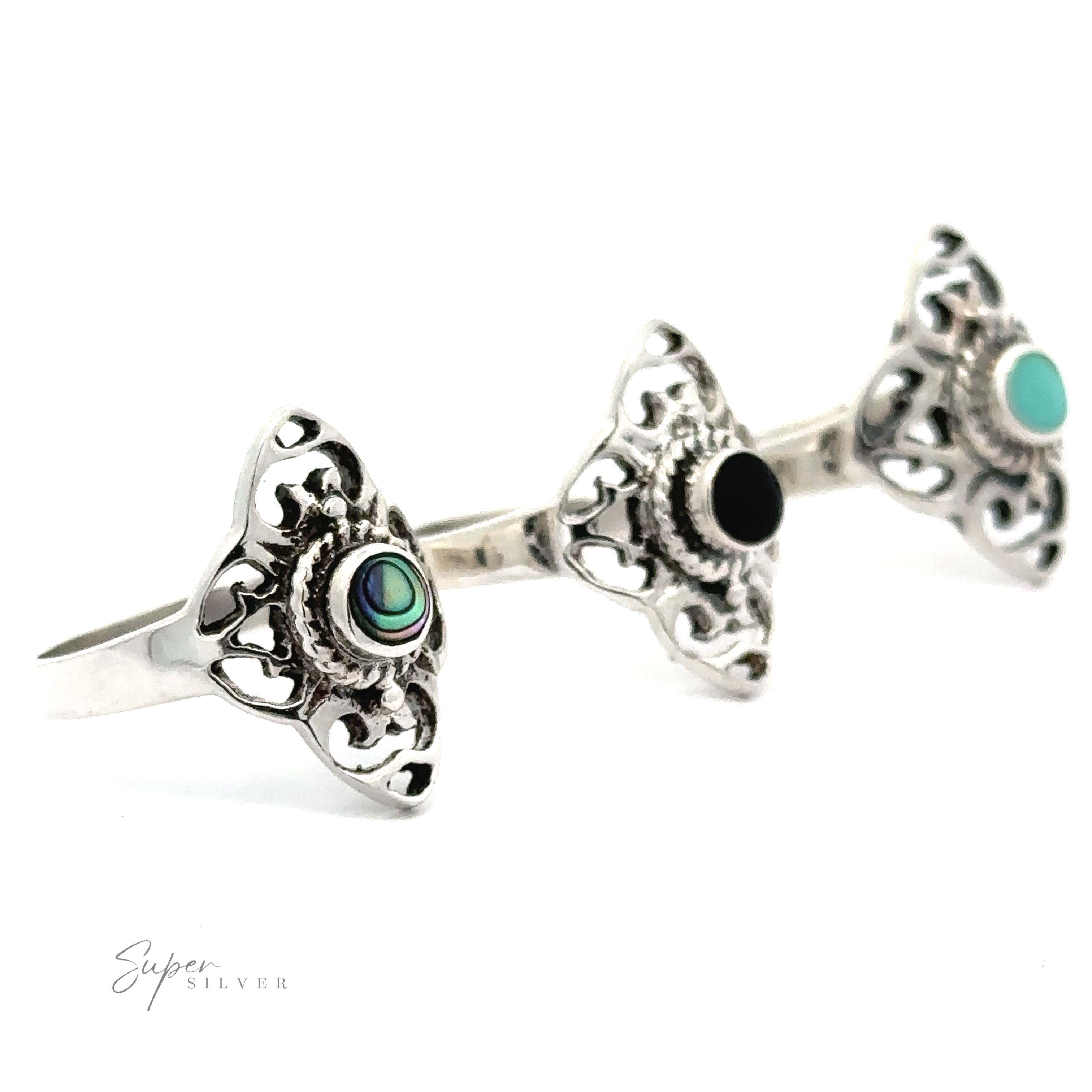 Indulge in the opulence of our silver filigree inlaid stone ring. This mesmerizing piece captures the essence of the Victorian era's grandeur and botanical elegance while adding a touch of boho-chic flair. Choose from the enchanting inlaid stones of abalone, turquoise, or onyx to add a personalized touch to your ring. With its flattering and timeless design, this silver filigree ring will become a cherished accessory, reflecting your individuality and evoking the spirit of romantic bohemian charm.